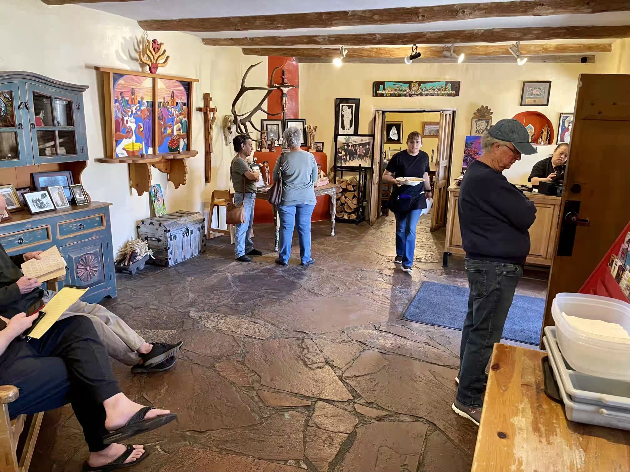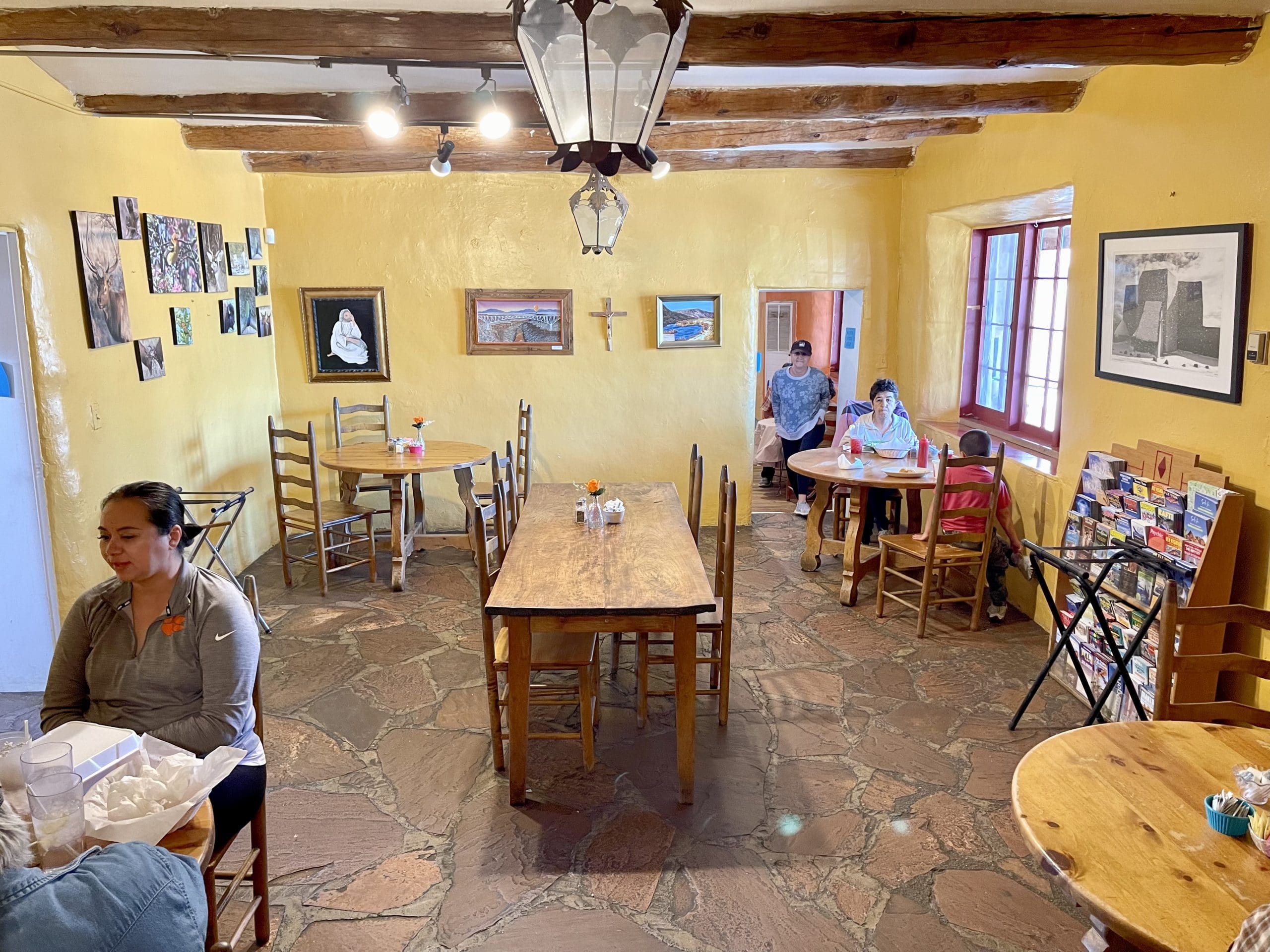 Both from an experiential and culinary standpoint, you can’t beat dining inside the venerable restaurant. Uneven flagstone flooring in- and outdoors means you should watch your step. That’s challenging to do when you step inside the spacious front room where intriguing artwork festoons the walls…and watch out for the rack of antlers at eye-level for most New Mexicans of average height. A distressed blue trastero with a traditional sunburst design and a petaquilla (trunk) are reminders of yesteryear when the restaurant may have served as a family home. The main dining room is actually smaller than the front room with four four-tops flanking a table for six.