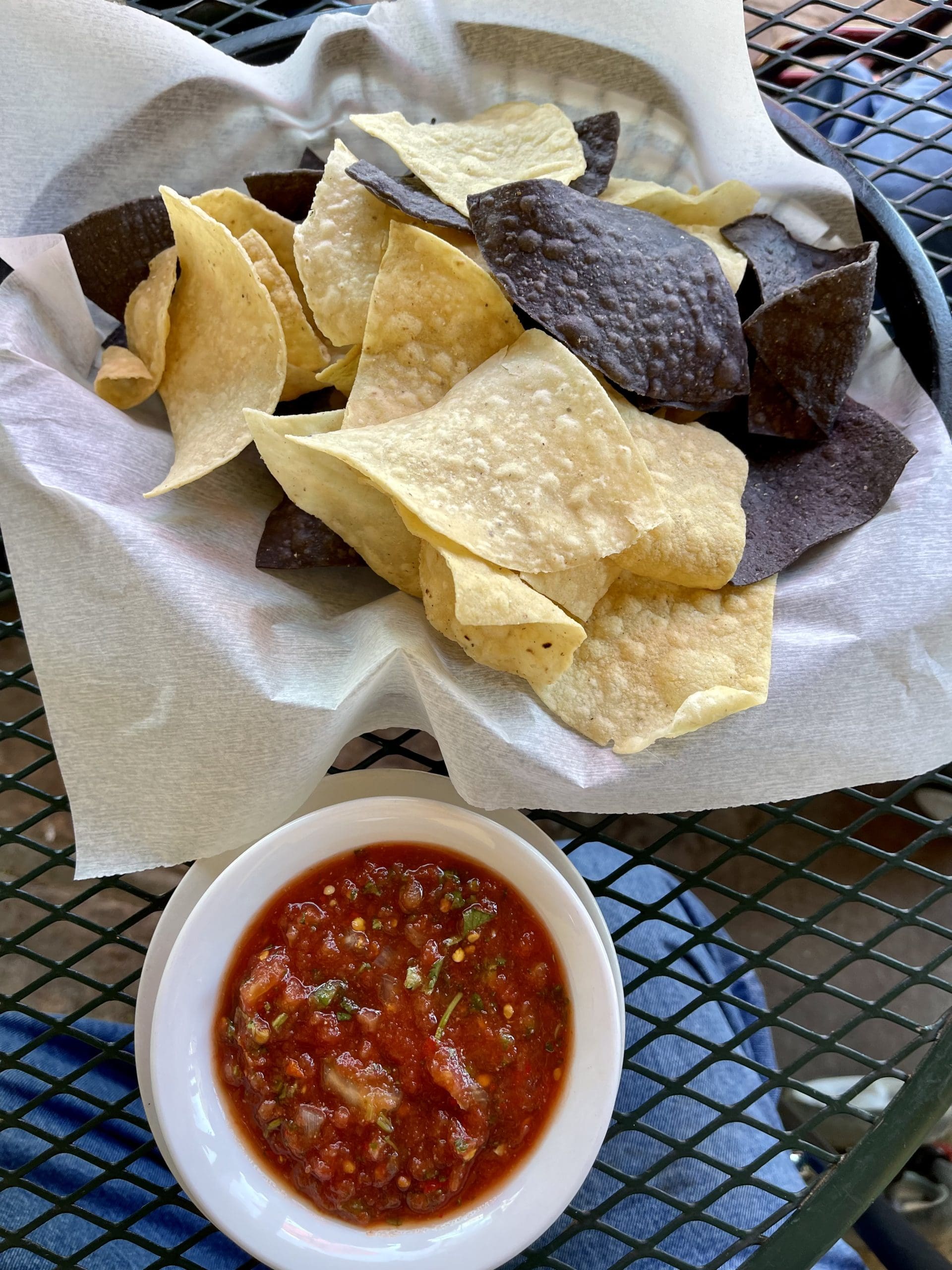 Appetizers include nachos; homemade salsa and chips; homemade guacamole, chips and salsa; chile cheese fries; and a bowl of beans and chile with a sopaipilla. While my preference would have been nachos (beans and cheese with sour cream and guacamole), I was outvoted…not that salsa and chips are a consolation prize. The salsa is fresh and lively…too lively for my mom and for my Kim. Once upon a time my mom’s heat tolerance was even greater than mine, but at 93 years young, her tongue and taste buds are no longer lined with asbestos. Crispy blue and yellow corn chips proved a worthy accompaniment to the jalapeno-based salsa, one of the freshest and tastiest I’ve had in a while.
