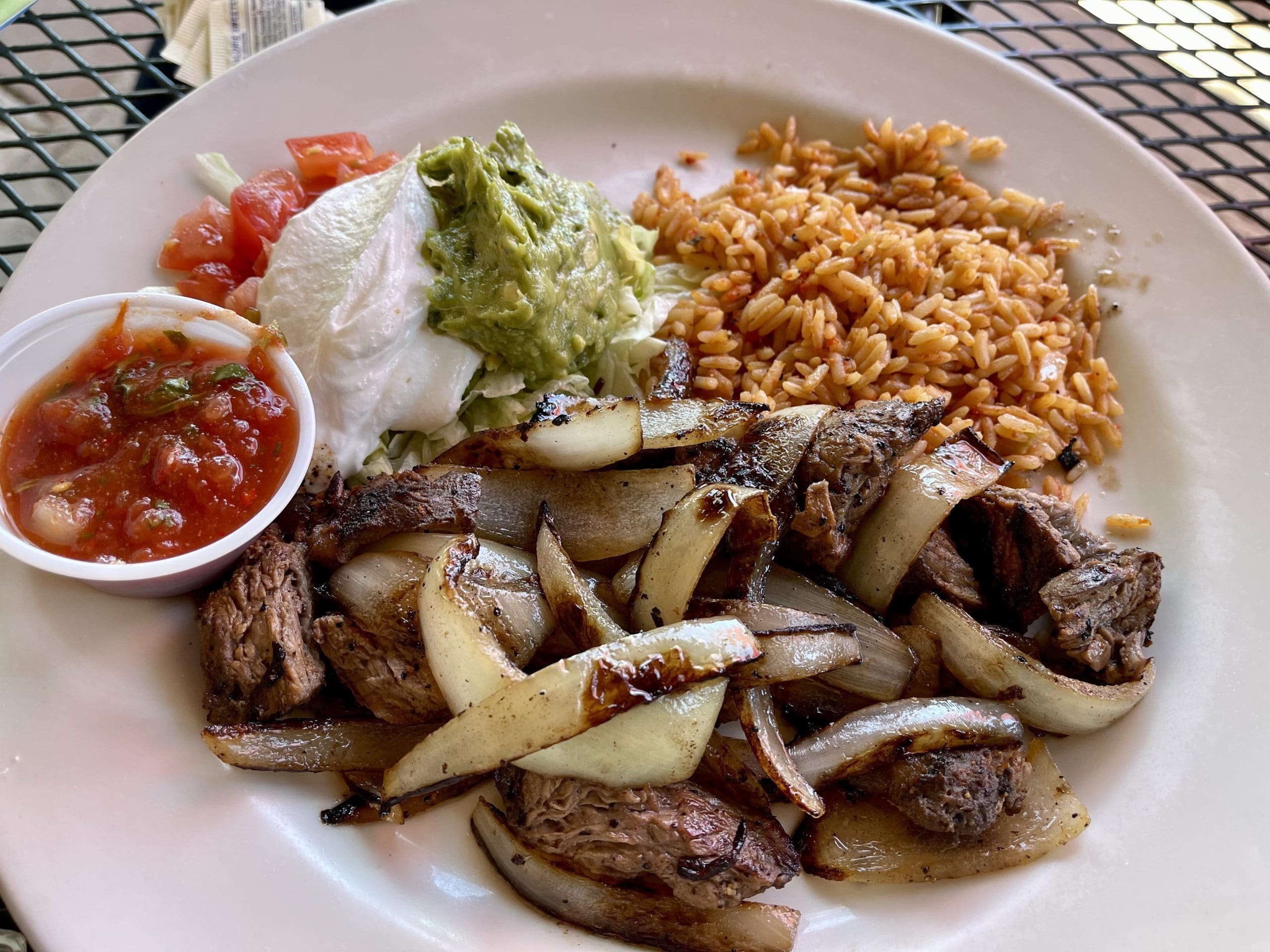 My Kim’s go-to choice-courtesy of a prescription change that ruined her tolerance of piquant foods–has become fajitas. Not that that’s a bad thing. Besides, fajitas allowed us to experience the “Grill” portion of the restaurant’s name. You may not know this–and hopefully it won’t ruin an illusion for you–but what gives fajitas their smoke and sizzle is the strategic spritz of liquid onto a plate. At the Ranchos Grill, you won’t experience that manufactured experience of the cloud of smoke and angry sizzle that sometimes accompanies fajitas. No sizzle and no show doesn’t mean no flavor. In fact, these fajitas are superb. My Kim is especially enamored of the nearly caramelized and translucent onions. They’re sweet and delicious, a perfect foil for the savory, meaty beef (or is that beefy meat?). Sour cream and guacamole are served with the fajitas as are thick, homemade flour tortillas.
