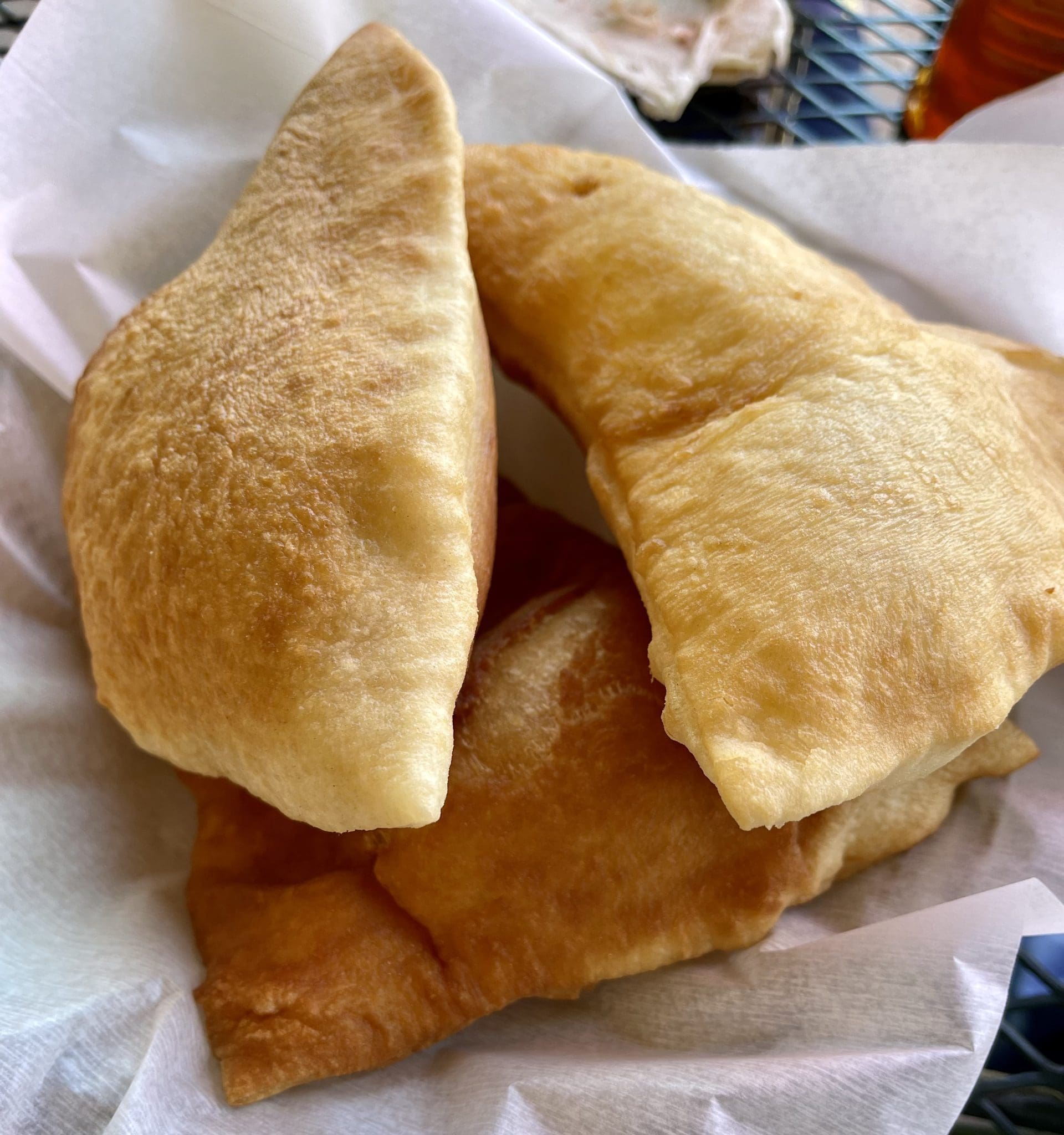 Guy and Hunter Fieri were introduced to stuffed sopaipillas during their November, 2022 visit to the Ranchos Plaza Grill. Guy commented on each sopaipilla being the size of his son’s head. None of us ordered the stuffed sopaipillas, but we did enjoy (immensely) the sopaipillas accompanied by real honey. These sopaipillas are puffalumpable pillows…indeed formidable. Tear them open and steam wafts upward just beckoning for honey. For most people, a sopaipilla or two with honey makes for a sizeable dessert, a magnificent melding of sticky sweet honey with light, crispy fried pieces of pastry dough. Culinary historians believe sopaipillas originated in Albuquerque. They were certainly perfected at Ranchos de Taos.