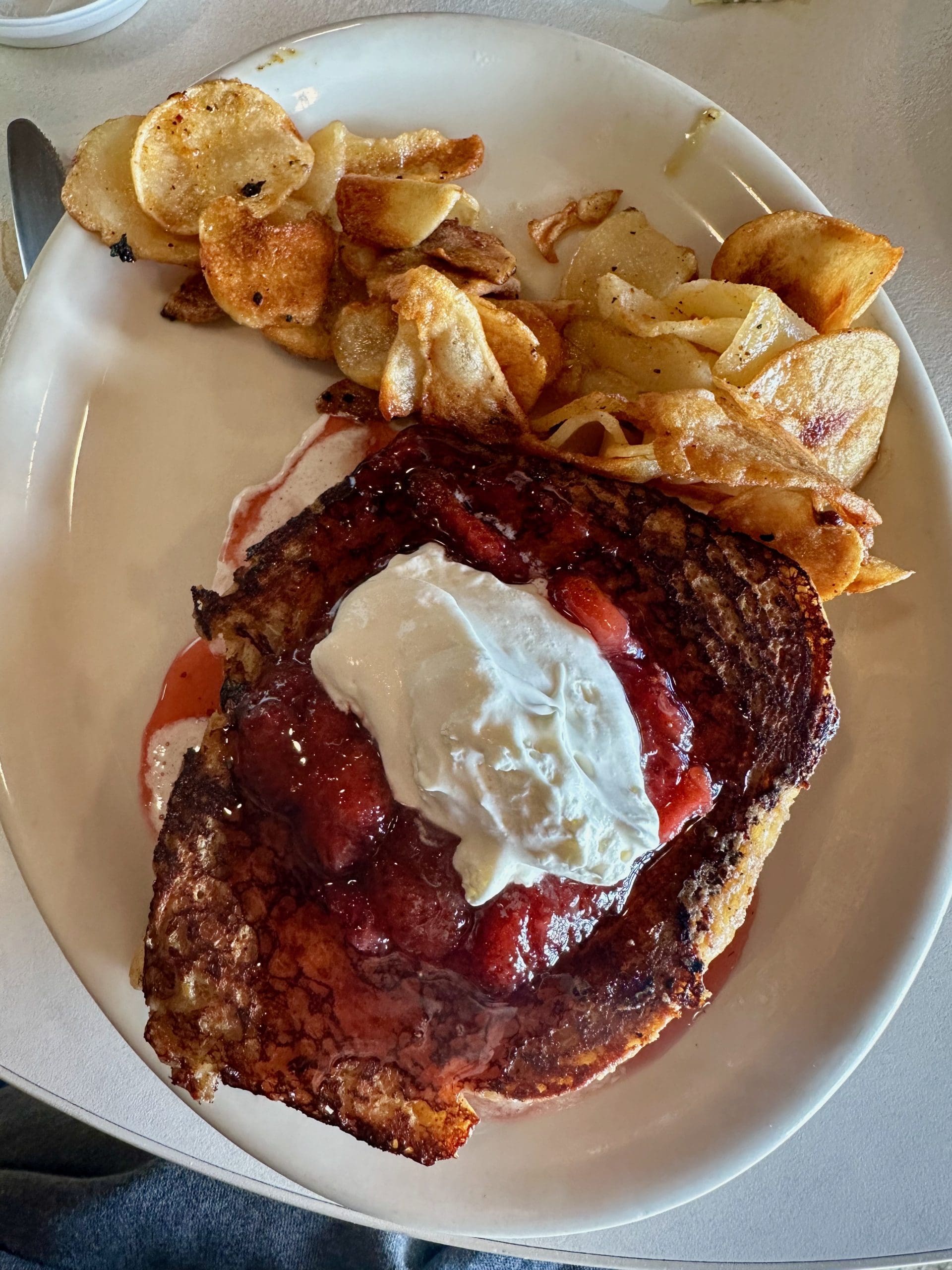 17 January 2024: In a departure from our normal ordering pattern, your humble blogger’s inaugural breakfast at Dulce River didn’t include red or green chile. Neither did my Kim’s even though she did order a burrito. That’s another story (below). My choice was stuffed French toast (scratch-made cinnamon roll soaked in French toast batter and stuffed with housemade seasonal fruit and whipped cream. To offset some of the sweetness, the French toast are served with house potatoes as thin, crispy and addictive as potato chips. The French toast are superb! Who needs conventional syrup when you’ve got a fruit compote? It’s sweet in its own right, but also tart and tangy.