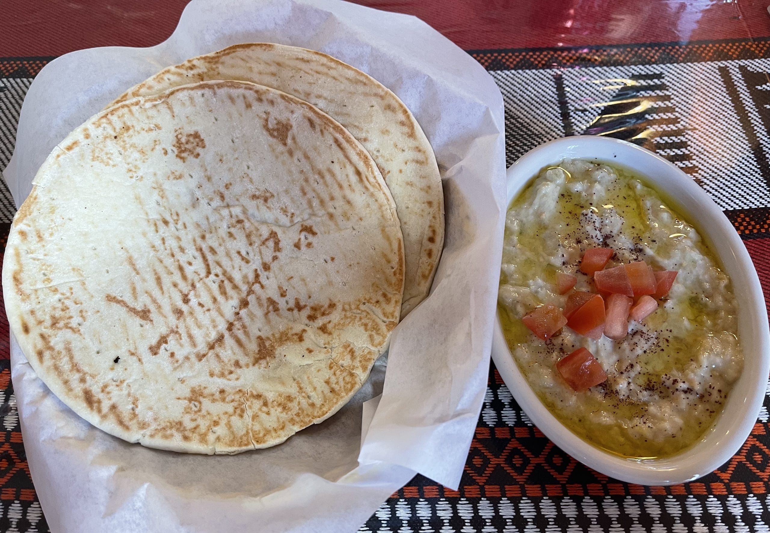 20 May 2023: Hummus is widely regarded as the quintessential Middle Eastern dip, so much so that it’s become ubiquitous well beyond the Mediterranean. While there’s no doubting its deliciousness, my preference has long been for baba ganoush, a rich Middle Eastern dip made from charred eggplant, onions, tahini, lemon juice, garlic, yogurt, olive oil, and salt. In her definitive tome A New Book of Middle Eastern Food Egyptian born food writer Claudia Roden refers to baba ganoush as “exciting and vulgarly seductive.” Great adjectives! Habibi House’s version is among the best in the metropolitan area, its distinctive smoky notes pervading every morsel. Better still, it’s served with perhaps the best pita in New Mexico. It’s pita nearly the size of a tortilla and it’s served out of the oven.
