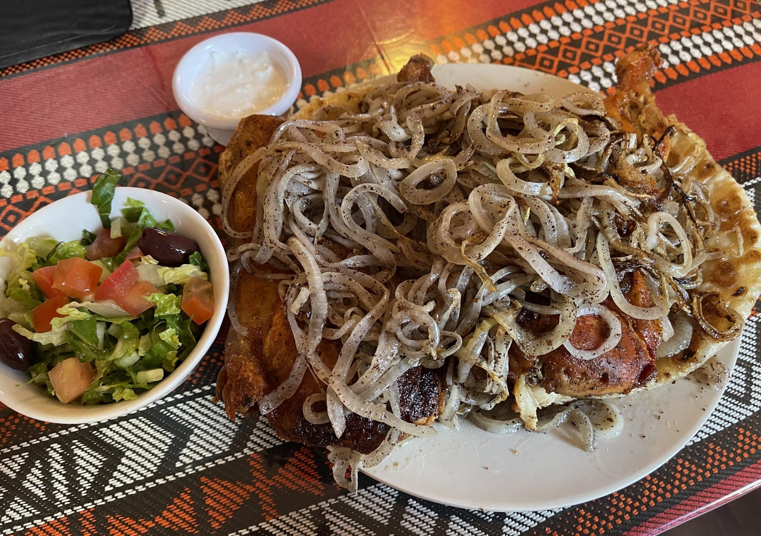 20 May 2023: On the Entrees section of the menu, you’ll find a delightful array of grilled proteins sure to please. That includes a grilled whole quail chicken (hmm, must be some kind of hybrid), musakhan and quarter, half or whole sized grilled chicken (seasoned with signature spices and marinated overnight). Confident she’d love it, my Kim ordered an entire chicken, reasoning she’d take at least half of it home. Splayed on a large plate, the chicken is literally covered by a tangle of pearlescent olives and sundry seasonings. It’s a good thing my Kim loves onions almost as much as she loves chicken. These onions were sautéed to the point just before they would caramelized. The chicken was moist, tender and wonderfully seasoned. Sheathed by a flavorful, crispy golden skin, this grilled chicken is a standard-setter.