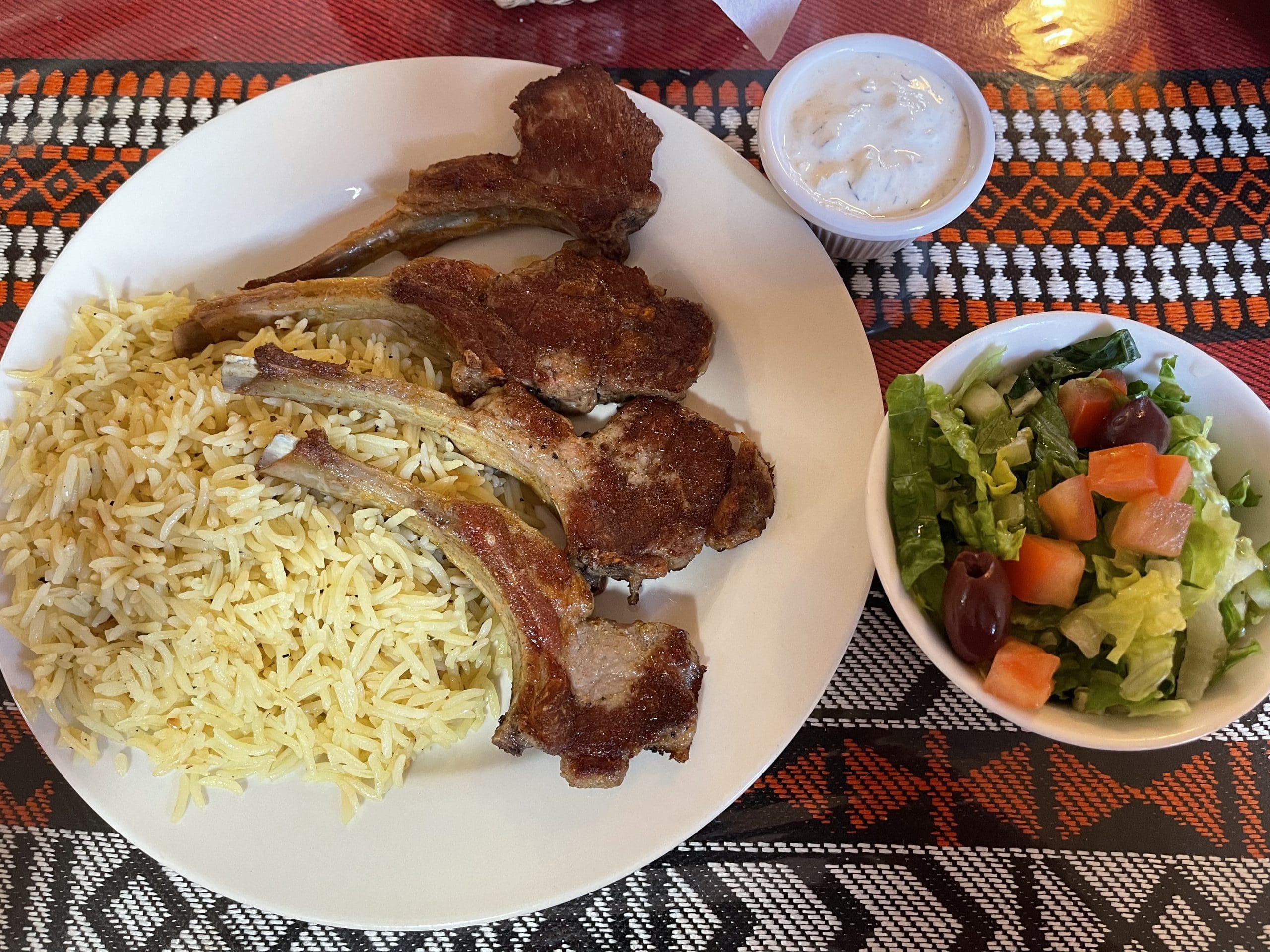 20 May 2023: In recent years lamb chops have become as costly as filling up the tank of an F-250. Sticker shock is inevitable should you order them at most restaurants. They’ve pretty much become a splurge item. When asked how I want my lamb chops prepared, I generally acquiesce to “however the chef decides they should be prepared.” Yeah, it’s a bit like trusting Alec Baldwin to teach you gun safety, but almost invariably the lamb chops are at a perfect degree of doneness. Such was the case at Habibi when four succulent lamb chops arrived at our table. Prepared to about medium, they had plenty of moistness and were nearly as tender as lamb meatballs. Best of all, they were priced at about a third what it would take to fill up that aforementioned F-250. The chops were accompanied by rice and a salad with some of the best tzatziki sauce we’ve had.