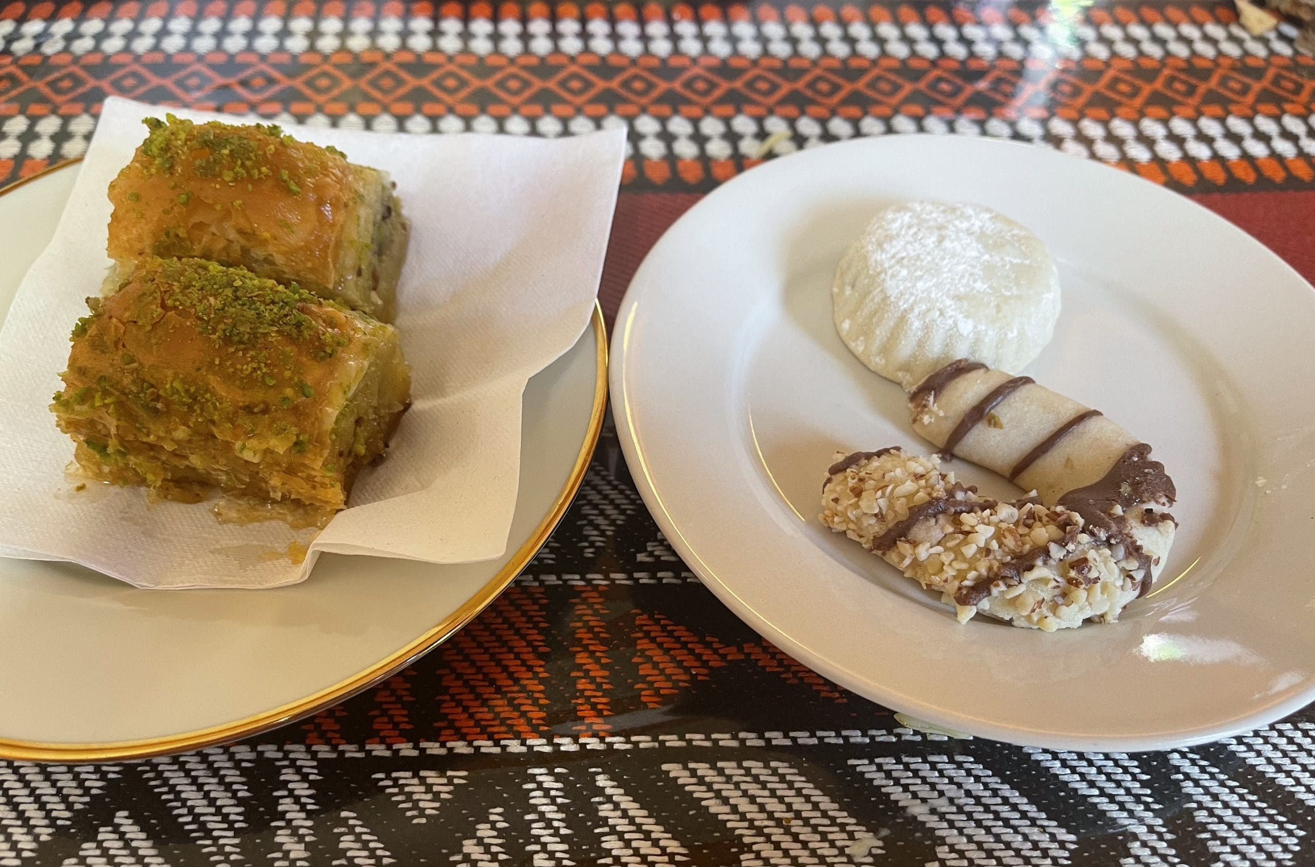 20 May 2023: Desserts included my favorite Middle Eastern post-prandial treat. Our server warned us that the pistachio baklava was very sweet. More than any other type of baklava, pistachio baklava is balanced. Sure it’s got the requisite cloying honey in between layers of crispy phyllo dough, but the crushed pistachios temper the sweetness of the honey very well. It’s still too sweet for my Kim who can wolf down Hostess cupcakes like they were water. Her dessert consisted of three Moroccan cookies, all far less sweet than the pistachio baklava. Our server told us that on Sunday Habibi House is taken over by a chef who serves Moroccan specialties. Sounds like a Sunday visit is in order.