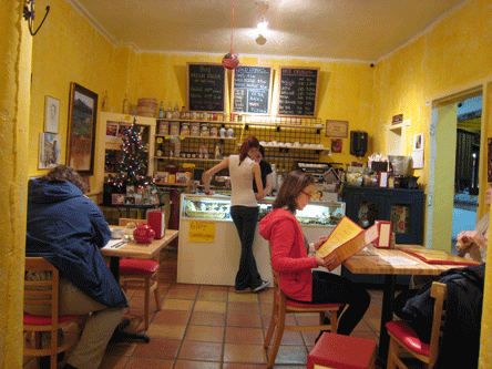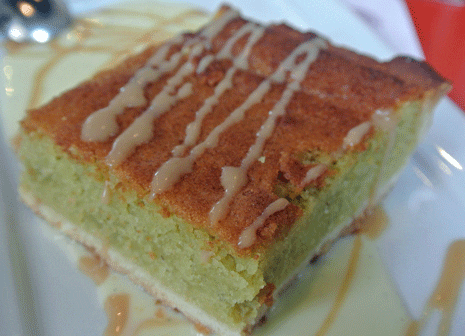 21 November 2012: If you’re in the mood for something not quite as rich or decadent, the pistachio square is the dessert for you. Pistachios are a versatile nut that can serve not only as a snack food, but in entrees and desserts. They lend a savory quality to desserts that are would otherwise be cloying– such as baklava at Yasmine’s Cafe. The pistachio square is a tarte in which finely chopped pistachios are the star and creme Anglaise is a counterpoint of sweet richness. The tarte is dense and moist with an excellent crust.