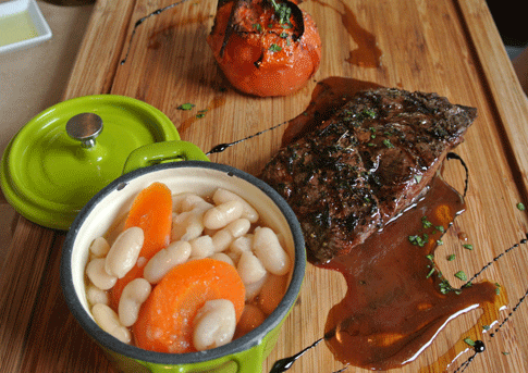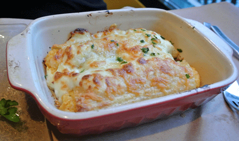 This entree is absolutely amazing, so rich and delicious grown men will swoon as they eat it and women will consider it better than chocolate. Maxime cooks natural beef cheeks for just over five hours in red wine then combines them with fresh ricotta and stuffs them into manicotti shells. They’re then baked in the oven with Bechamel, Pecorino Romano and Fontina cheeses melted over the top. The richness of this dish should be paired with an acidic side such as the aforementioned tomato soup. It’s a heavenly pairing.