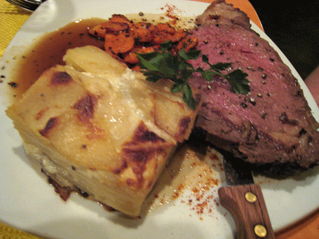 9 December 2011: Dinner might mean something unexpected such as a featured special of roasted prime rib au jus served with a potato gratin and vichyssoise carrots. The prime rib is a slab of wonderfully roasted (Lowry’s quality) just-off-the-bone prime rib with a perfectly pink hue redolent with a peppercorn enhanced au jus. It’s nearly fork-tender and as juicy as any prime rib you’ll ever have. The potato gratin is a beauteous brick of thinly sliced and layered potatoes and cream seasoned with garlic. The top layer is beautifully browned and each layer underneath perfectly prepared. While the term vichyssoise is most often associated with a cold French soup, the term actually means “from Vichy” a city in France. Torinos’ vichyssoise carrots have a sweet (but not overly so) flavor and a crisp texture (a boon for those of us who don’t want mushy carrots).