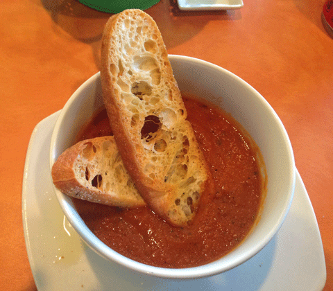 4 November 2013: How many of us have ordered tomato soup at an Italian restaurant that’s reminiscent of the soup in a can with which we grew up? Not so at Torino’s where tomato soup means oven-roasted tomatoes, garlic, fresh thyme, basil and homemade croutons. There is no cream or chicken broth in this soup. It’s rich, sweet-savory tomatoes at their comfort food finest. It’s a simple soup made extraordinarily well from excellent ingredients.