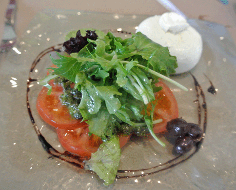 5 April 2014: The Caprese salad may be a simple salad, but it’s imbued with qualities that elevate it to greatness. At its essence, this salad is a concordant combination of flavors, textures, and freshness: ripe tomatoes, fresh mozzarella cheese, aromatic basil, and your choice of drizzle: either or both olive oil or balsamic. Torinos takes this simple salad and raises it to rarefied air. Instead of mozzarella, this salad is constructed with burrata, an almost unnaturally soft and moist fresh Italian cheese made from cream and mozzarella. Burrata is ethereal in its texture and as rich a cheese as you’ll find. A wonderful fresh basil pesto takes the place of the all-too-ordinary basil. Olive oil is drizzled onto the resplendent greens and ripe tomatoes while balsamic circumnavigates the dish. Simplicity meets sophistication can be delicious.
