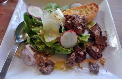 26 December 2014: Implying that someone was “chicken-livered” was of the most deleterious insults one person could levy against another during the late nineteenth century. For offal-loving foodies, the term chicken liver can only mean one thing–deliciousness. Some chefs go out of their way to obfuscate the distinctively rich, creamy and slightly metallic flavor of chicken liver, a favorite tactic being marinating it in or pairing it with agrodolce (sweet and sour) sauces. Kudos to Maxime for not disguising what is really a tender and mild flavor (at least in comparison to beef liver) and letting it shine.
