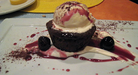 9 December 2011: Some diners might not brave a dessert which translates from French to “half cooked,” but then they’d be missing the rich deliciousness of Torinos’ chocolate mi-cuit. Similar to the molten centered chocolate cakes served in highly regarded restaurants such as Roy Yamaguchi’s eponymous Roy’s, this is a chocolate cake so decadent it can only be finished if shared. Torinos’ rendition is topped with vanilla ice cream and served with amarena cherries. Amarena cherries, grown mostly in Bologna and Modena, Italy, start off as slightly sour cherries, but they’re preserved in a rich, sweet syrup that makes them nearly cloying. The vanilla cuts the sweetness nicely as does the adult chocolate.