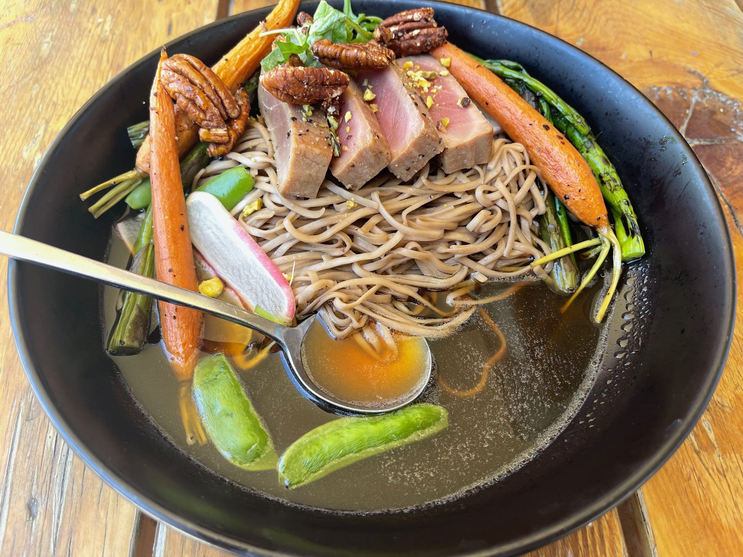 “Bowls” aren’t normally “my thing,” but the six bowls on the menu invited me to try something different. My choice was called Zen Noodle (seared ahi tuna, soba noodles, snap peas, local citrus ponzu, asparagus, radish, baby carrots, roasted pistachio), perhaps because when eating the dish, you get a sense of relaxation and not worrying about things that you cannot change. Or maybe it’s because the ingredients coalesce into such a harmonious balance that every bite offers deliciousness and surprise. The variety of flavors and the freshness of ingredients makes this not only a zen dish, but one that’s bound to make you happy. Snap peas and baby carrots, in particular, are among my favorite vegetables and to have them both in one dish was a reward.