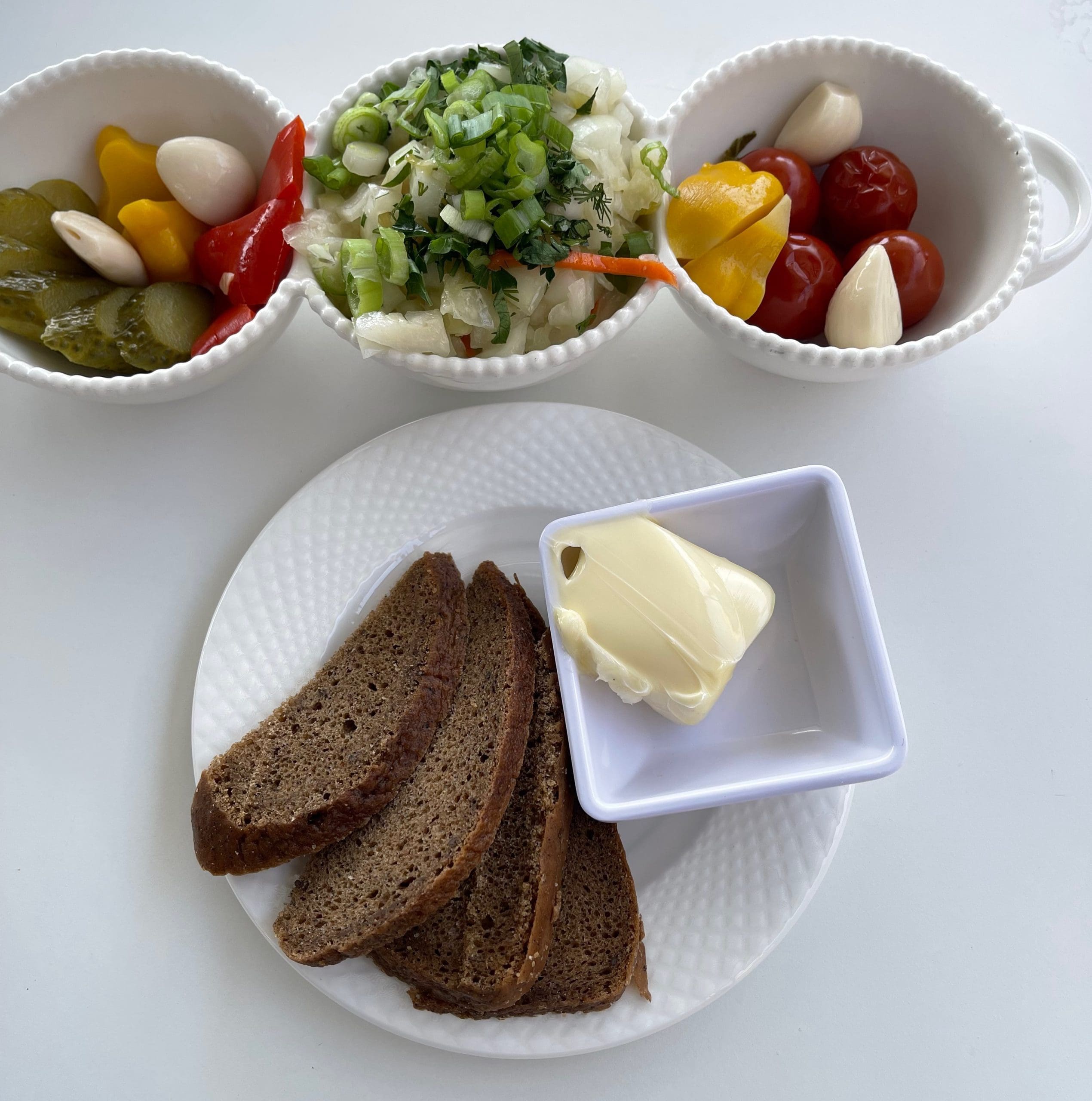 Among the appetizers are several that belie any of the aforementioned myths about Russian cuisine. We selected Assorted Pickled Vegetables (tomatoes, cucumbers, garlic, pattypan squash and homemade sauerkraut served with authentic Russian rye bread). Frankly when we ordered this preprandial combo, we weren’t sure what to expect, but we do know how much we love pickled vegetables. We were surprised that the pickling wasn’t of the lip-pursing variety. Sometimes pickling obfuscates the flavor of vegetables. Alyonka’s brine and spices allowed the freshness and crispness of all vegetables to shine. Also quite luminous is the Russian rye bread with butter. It’s a rather thin bread, but it’s earthy and tangy with that distinct sour aftertaste.