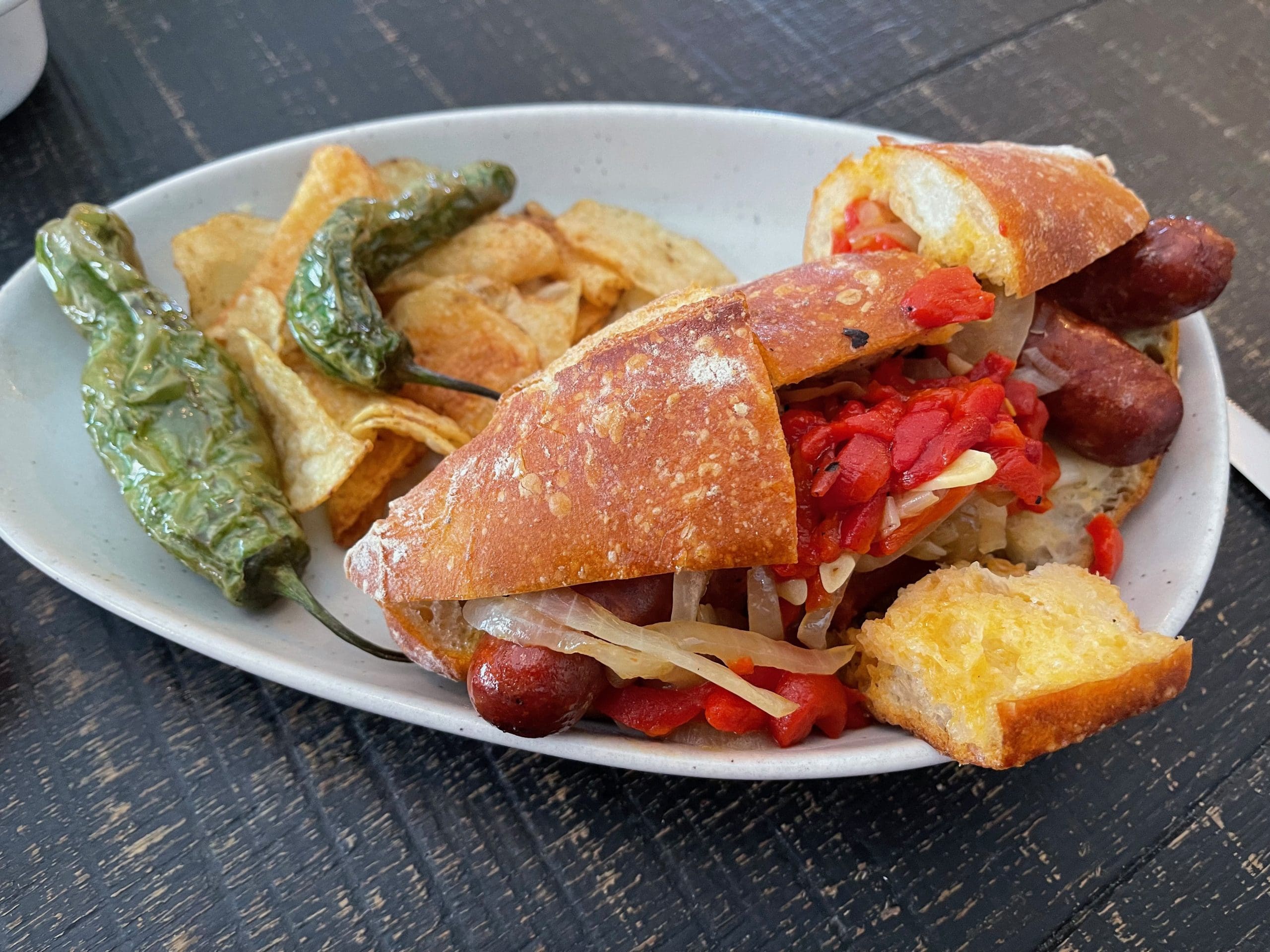 The Ansots menu lists eight bocadillos, a Spanish sandwich served on a baguette or similar bread. I asked Ellie to tell me what her three favorite bocadillos are and then to bring us any of the three, knowing that we’d enjoy them. Her choice for us was the Chistorra (two smoky and somewhat spicy Chistorra sausages with grilled onions and pimentos on a baguette). As with all the chorizos on the menu and those offered as bulk products, the Chistorra is hand-made using family recipes that have been passed down over the years by the Ansotegui and Inchausti families. The Chistorra was magnificent with an assertive personality barely offset by the caramelized onions or sweet, mild pimentos. The baguette was superb, too, a magnificent canvas for a masterpiece.