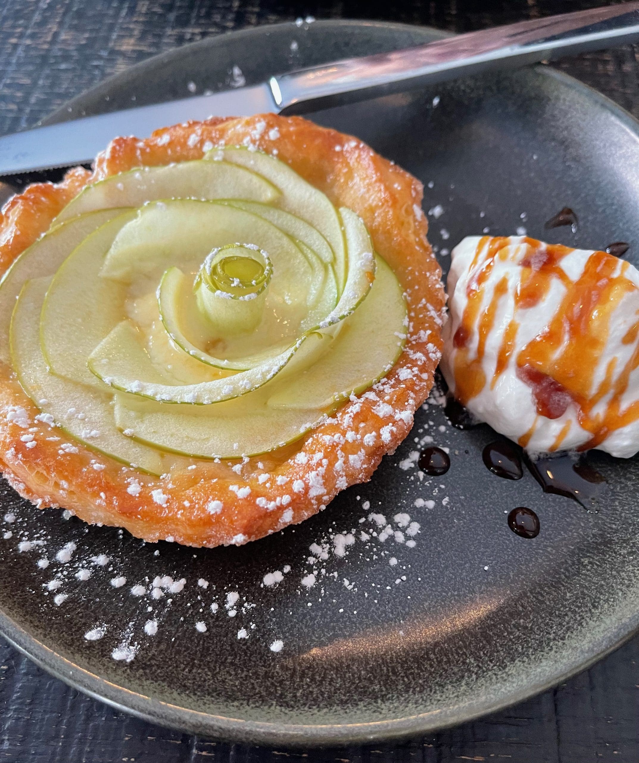 Wonderful as the burnt cheesecake was, it may have been the third best dessert on our table. “Best” honors might be accorded to the tarta de manzana, a house-made puff pastry with an Italian vanilla pastry cream, thinly sliced apples glazed with an apricot marmalade. The apples crowned the pastry with a thinly shaved floral design. The combination of flavors ranged from sweet to tart to absolutely decadent. It’s probably what love would look like as a pastry. John showed what a good friend he is by sharing it. I may put him in my will for that act of munificence.