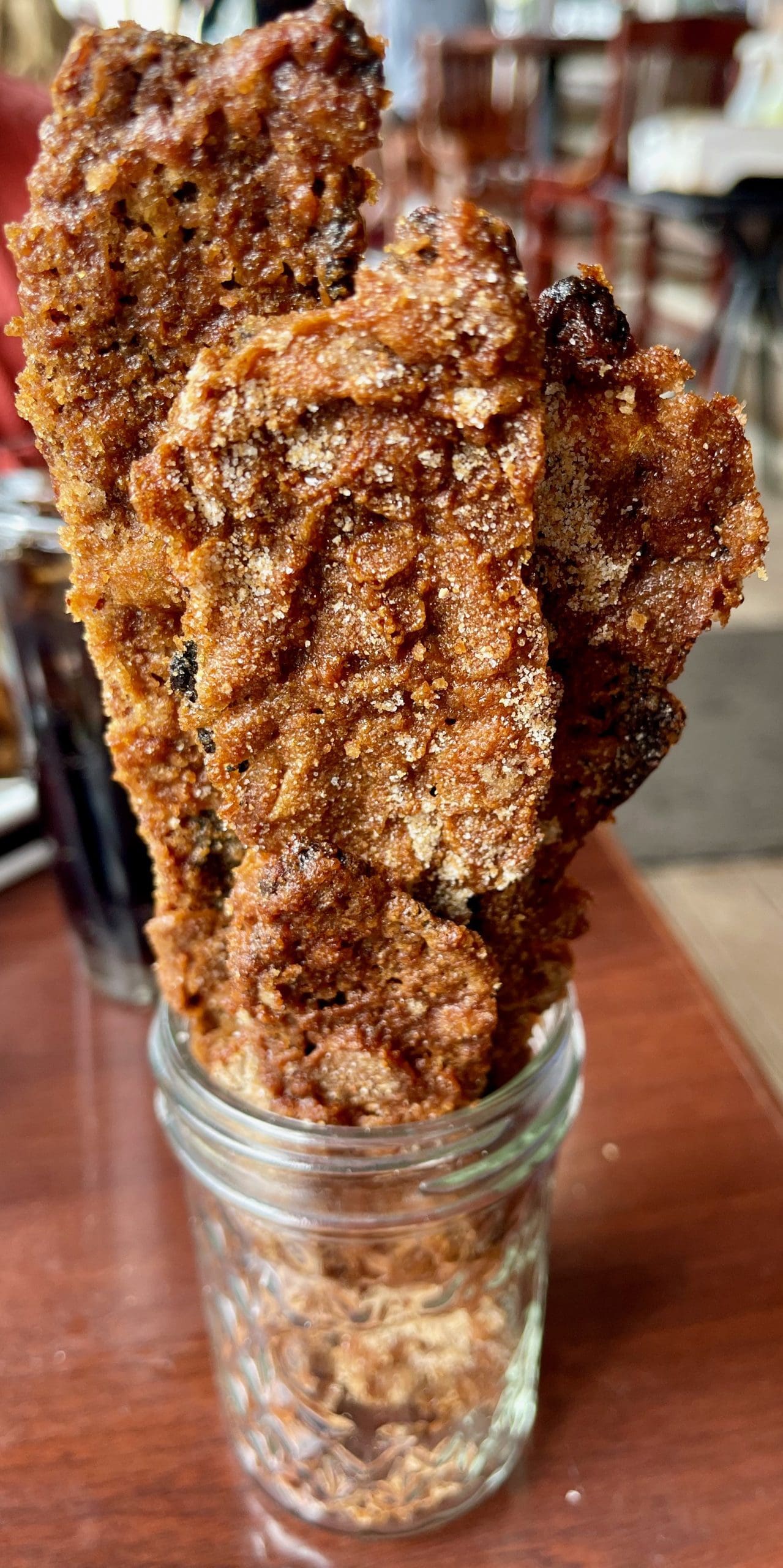 We couldn’t resist the temptation to try the Pig Candy if only to compare it to a similar bacon item proffered by the still missed Gold Street Cafe. Our verdict–just as good though twice as messy. Pig Candy is a guilty pleasure, an indulgence you could get hooked on. Ingredients include white sugar, brown sugar, black pepper, mustard and molasses. It’s an alchemic masterpiece. Served in a Mason type jar, the bacon itself is sliced thick and is at least twice as tall as the vessel in which it’s served. Each piece is crunchy and crumbly, a satisfying mess.