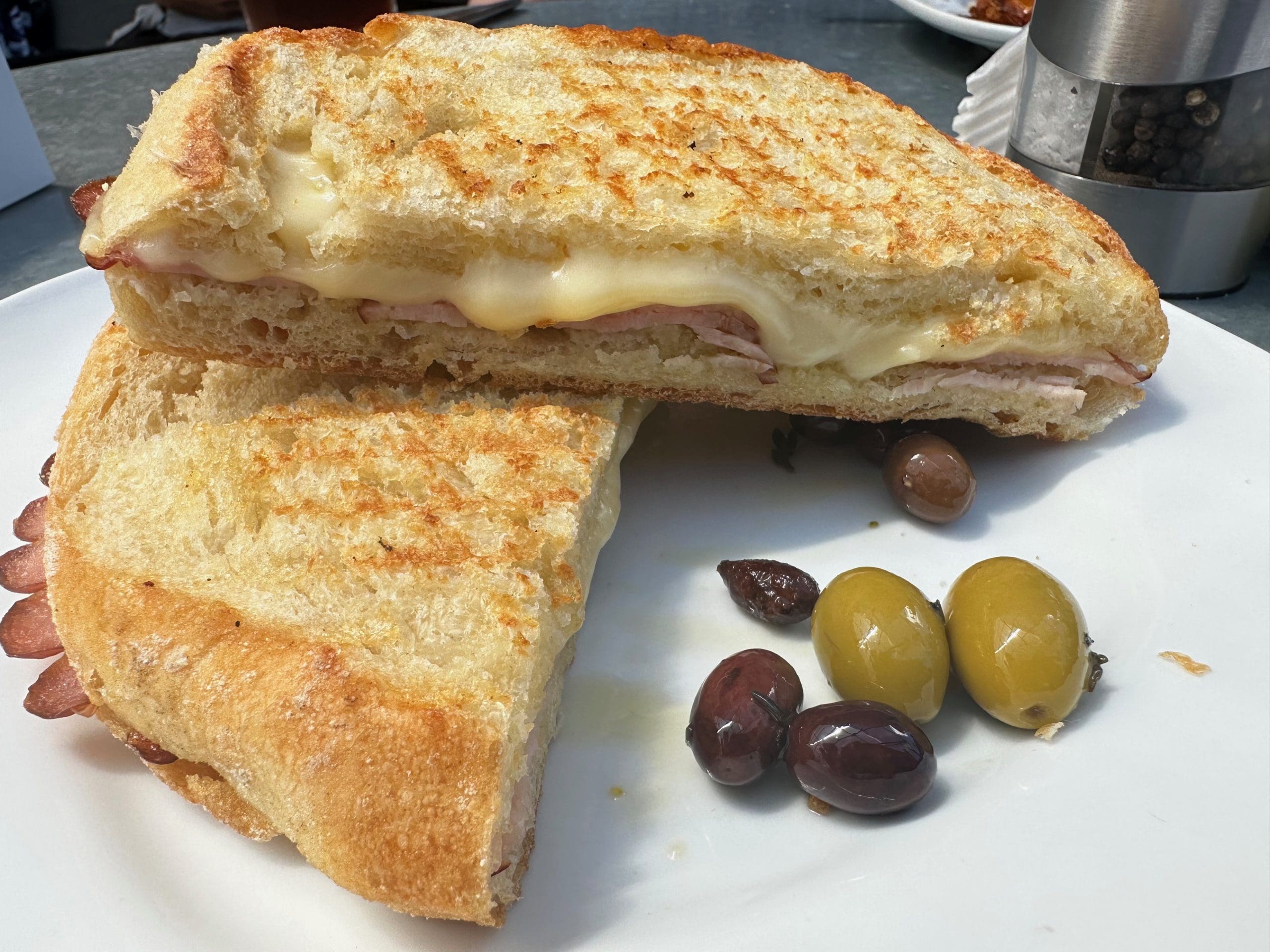 My Kim’s sandwich choice was even more basic–a ham and Fontina cheese sandwich on sourdough. Grilled to a golden perfection and just long enough for the Fontina to form a molten blanket over the ham, this is a simple sandwich prepared extraordinarily well. One of the many things we’ve always loved about Sage bread is its texture. In no form is that texture more evident or self-actualized than on a panini sandwich. The exterior has a discernible and delightful crunch that gives way to a soft (but not too soft) interior. This is what the staff of life is supposed to feel and taste like! Our sandwiches were served with pitted olives, a nice alternative to chips or fries.