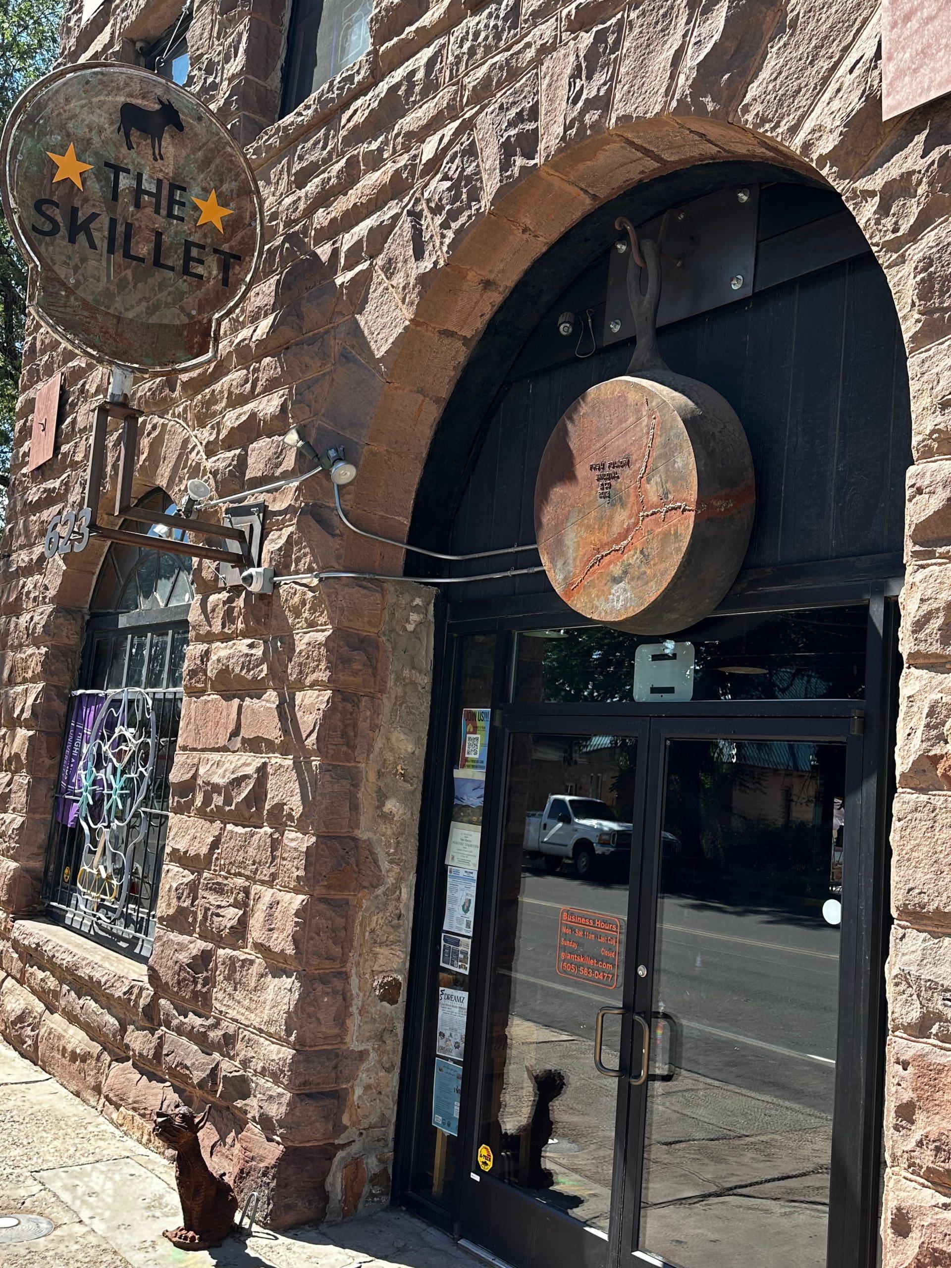 Even a 98-pound wife wielding an ordinary frying pan would scare the tar out of her husband. Fortunately when my Kim sees a frying pan, she wants to cook something not hit me over the head with it . You can imagine her sense of wonder in seeing the 300-pound cast iron skillet hanging overhead as we stepped into The Skillet which self-glossses as “Las Vegas NM’s #1 Gastropub.” She entertained hopes of buying a new skillet or six to add to the 6,000 hanging on our pot rack. Alas, there were no utilitarian skillets for sale at The Skillet, a restaurant Desiree Aguilar, my friend and former colleague at the University of New Mexico, has been selling me on for a long time now. She assured me there’s nothing in Las Vegas like it. Desiree is not prone to hyperbole or understatement. You can take what she says to the bank.