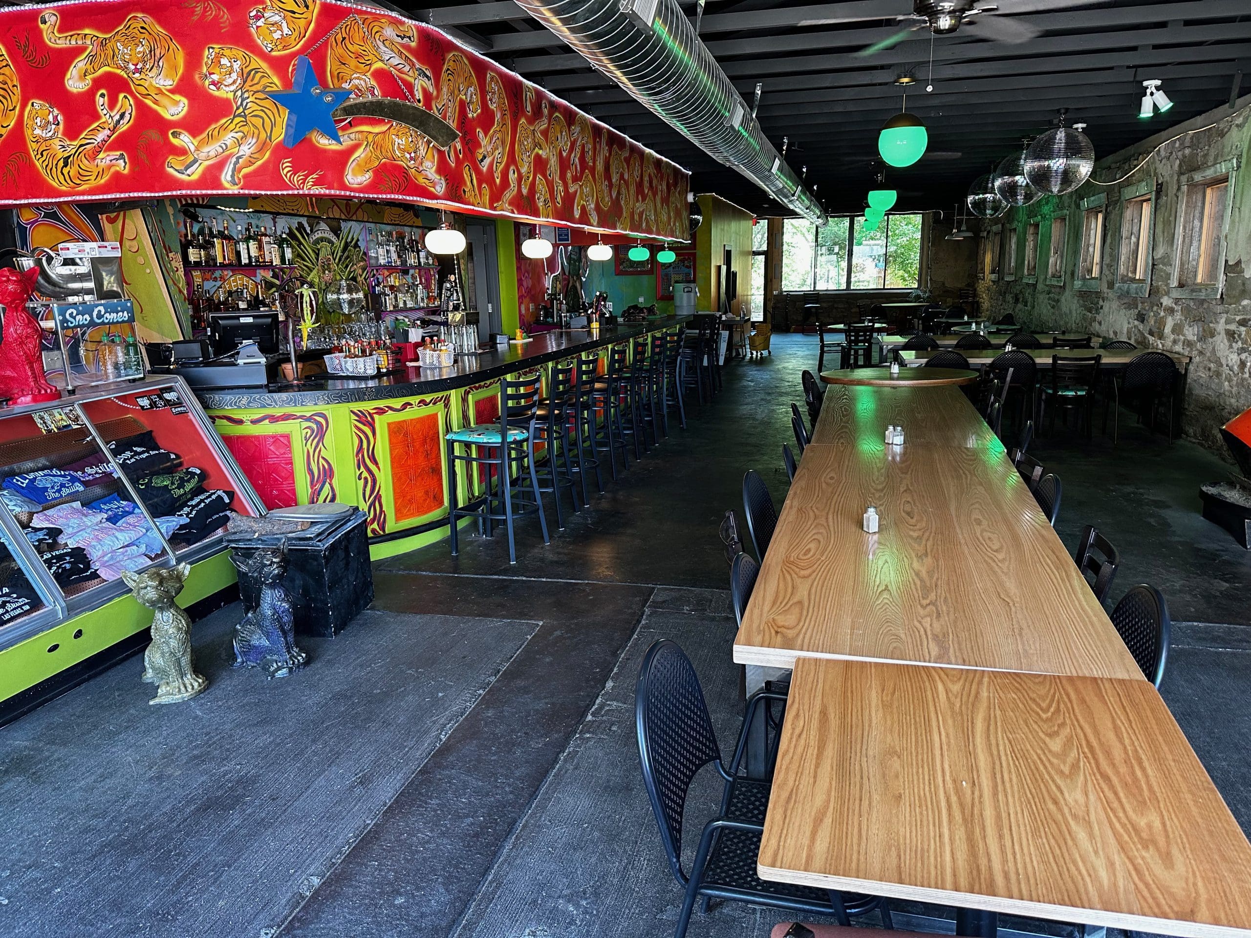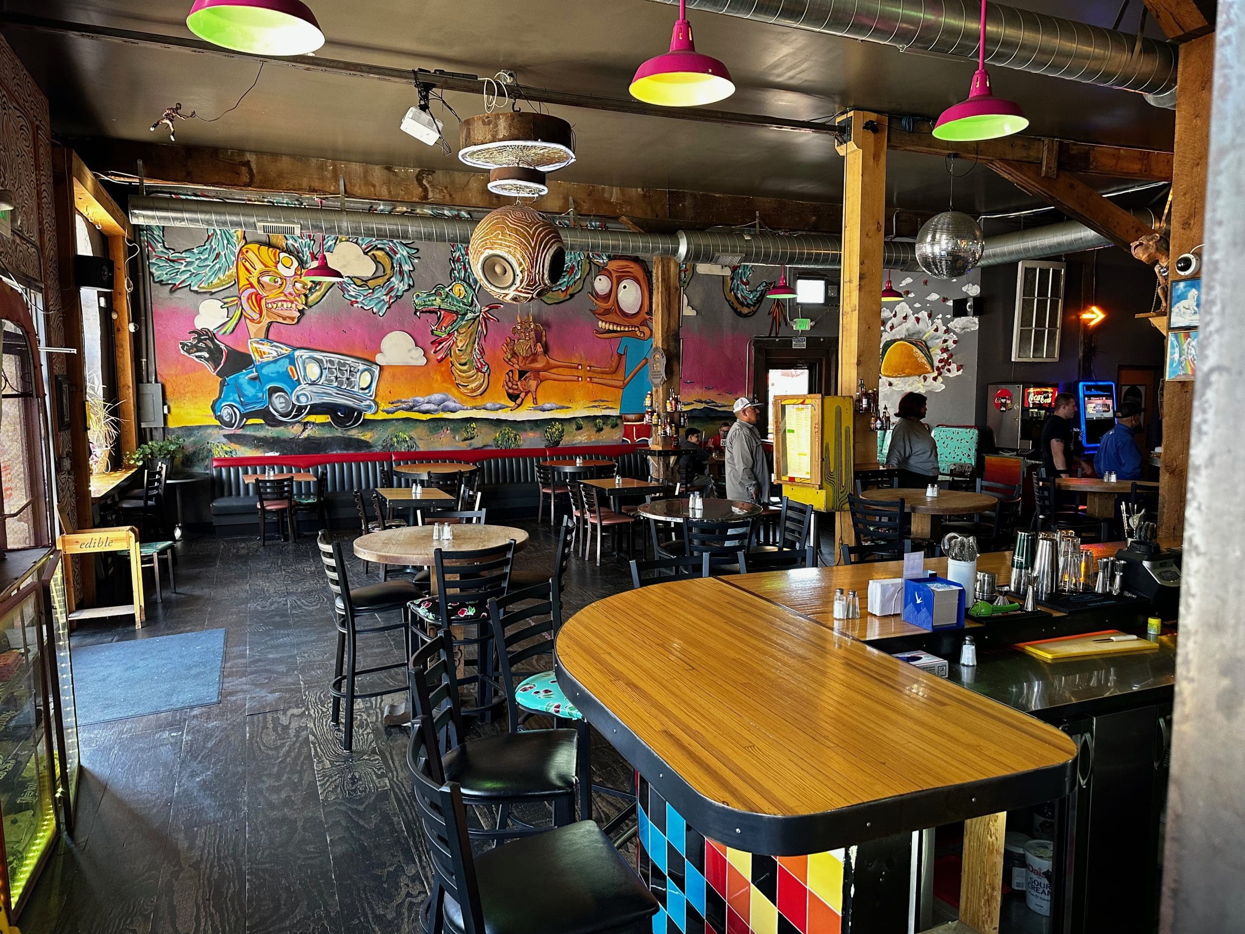 At first glance, The Skillet looks like just another long-in-the-tooth building and indeed, it is that. The Skillet resides in a renovated limestone building built in 1924, originally known as “The Teichert Wool Warehouse.” It’s when you step inside The Skillet that you’ll wonder if this colorful menagerie of immersive art doubling as a gastropub was misplaced by culinary gods who intended it for Las Vegas, Nevada. Seriously, there’s so much to see everywhere you turn. A number of rentable electric scooters parked in front of The Skillet may be indicative of the demographic which most appreciates this avant garde eatery. Though many of the diners lined up to place their orders were Highland University students, more geriatrically advanced diners like me will feel right at home, too.