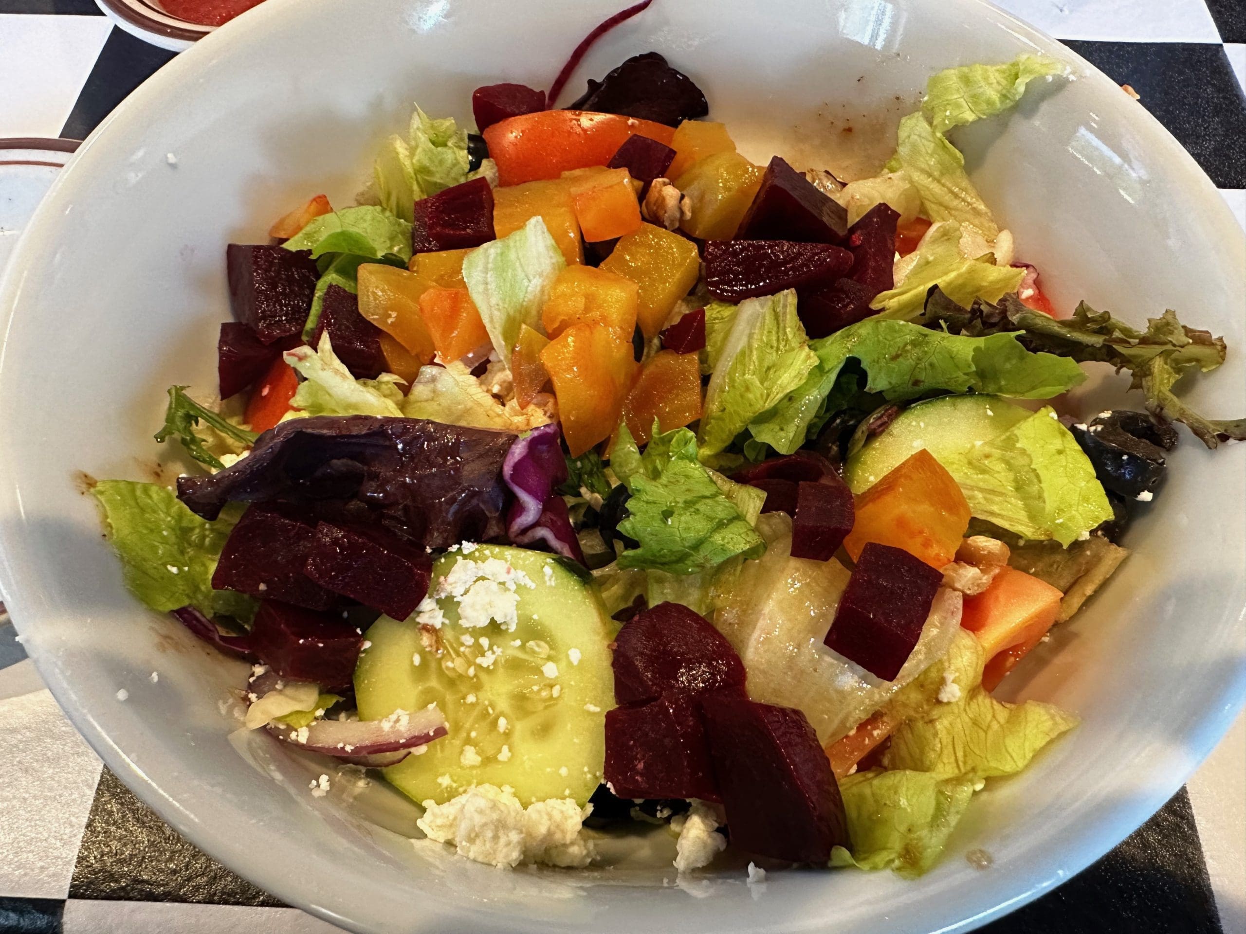 One of specials of the day during our inaugural visit was a goat cheese and beets salad (mixed greens, tomatoes, cucumbers, red and golden beets, walnut, goat cheese). If beets aren’t your thing, the menu includes a goat cheese salad sans beets. The salad brought to mind John Keats poem “Fill For Me a Brimming Bowl.” Our bowl was indeed brimming–finally a salad large enough to share. Nutritionists will tell you the red beet contains betacyanins pigments; the golden beets contain betaxanthins (both antioxidants and anti-inflammatory agents). Restaurant critics will note the barely discernible differences in flavor. While both can be described as “earthy,” golden beets are just slightly sweeter, milder and less earthy. We love them both as we did the entire salad and its varied ingredients.