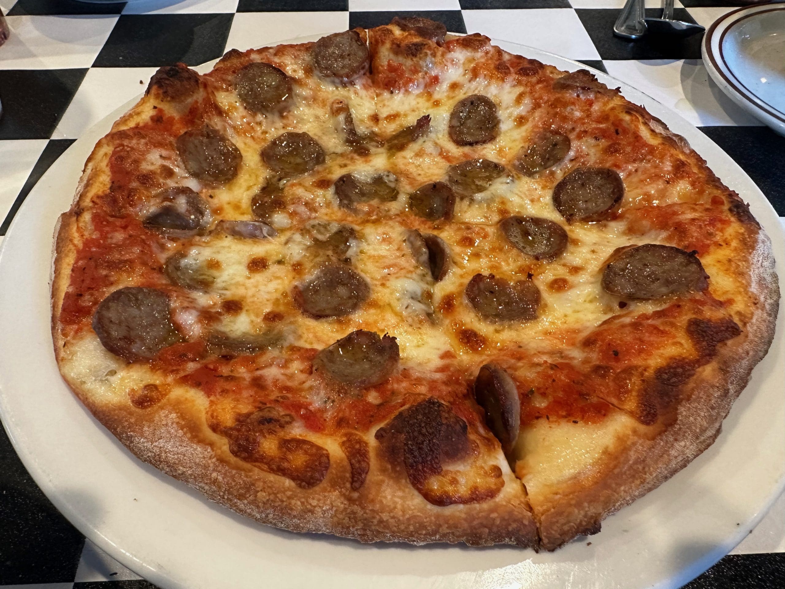 Also a lover of leftovers, my Kim ordered a ten-inch sausage and cheese pizza knowing we’d be bringing half of it home–even after giving me a slice. Moreso than on most pizzas we’ve had in New Mexico, the sausage was redolent with fennel. It perfumed the air and delighted our taste buds. Perhaps because it’s a bit thicker than the waifishly thin pizzas in favor today, the ten-inch pizza seemed bigger. With a bready cornicione ((Italian word for the edge or rim of the pizza), easily the thickest part of the pie, this is a pizza most people will love. Sauce and cheese were both generously applied.