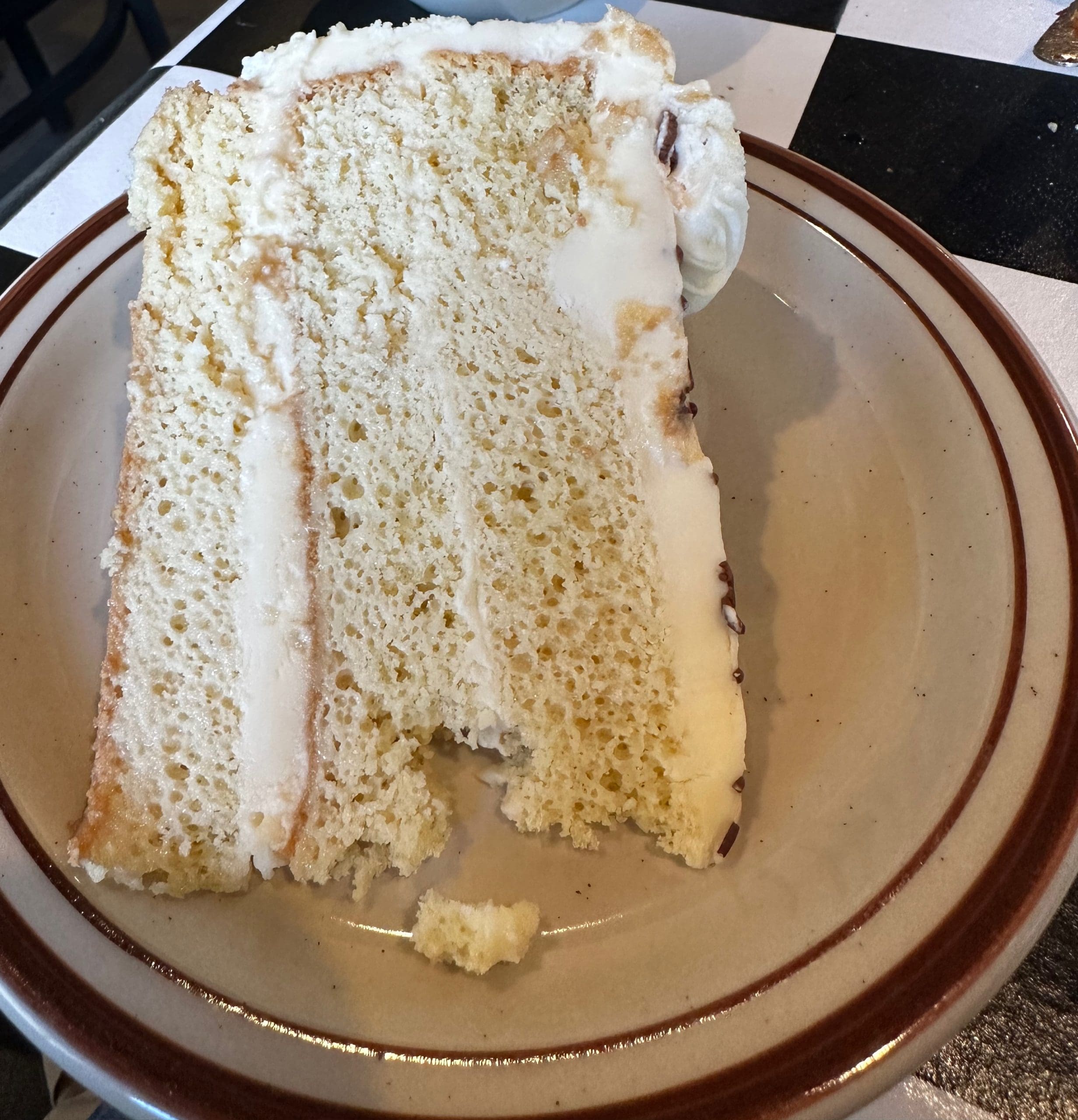 Again belying the smallness of the restaurant, Piccolino has a surprisingly robust dessert menu featuring everything from tiramisu to tres leches cake. The latter is my Kim’s favorite. This multi-layered tres leches is pockmarked and porous perhaps so that the three milks which comprise this Mexican standard can ooze out. The top layer of frosting is rather thick and sugary the way my Kim likes it. A generous slice was more than she could finish.