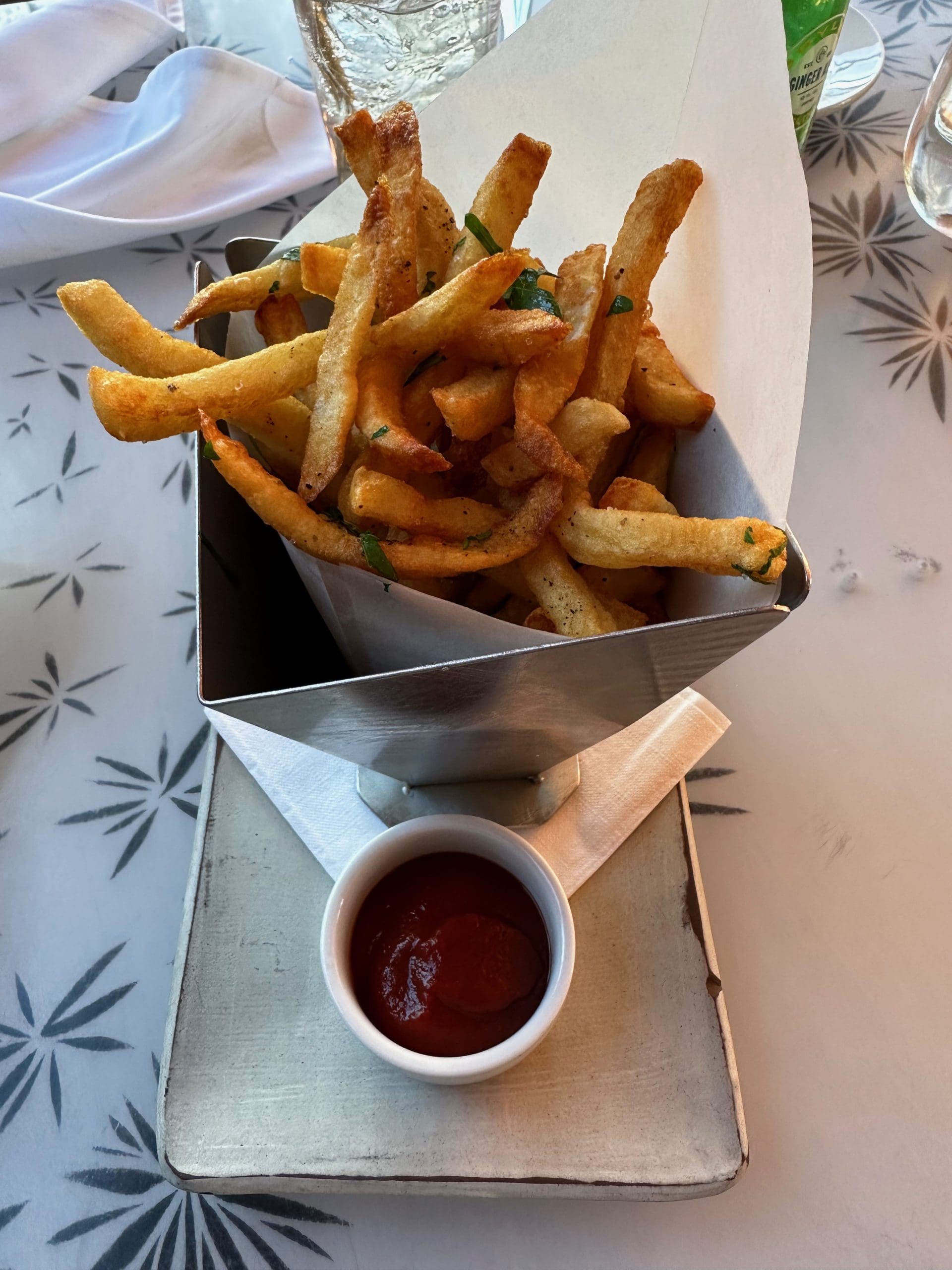 We began our culinary explorations with duck fat fries, one of the dishes for which the Chef is famous. Maple Leaf Farms outlines why duck fat fries are the way to go: “With Duck Fat Fries, you are able to get the best tasting fries without sacrificing the health benefits. Duck fat does not only keep the traditional salt flavor of the fries but adds the umami flavor that blends perfectly with the salt that season’s fries. The duck fat can withstand high temperatures so the fries come out tasting crispy on the outside and delicious on the inside. It also contains healthy monounsaturated fats, vitamin E and oleic acid. Fast and easy to make, these fries will not disappoint! I can’t add much more though I’d certainly like to subtract one fry at a time from the conical shaped container in which those fries are nestled.