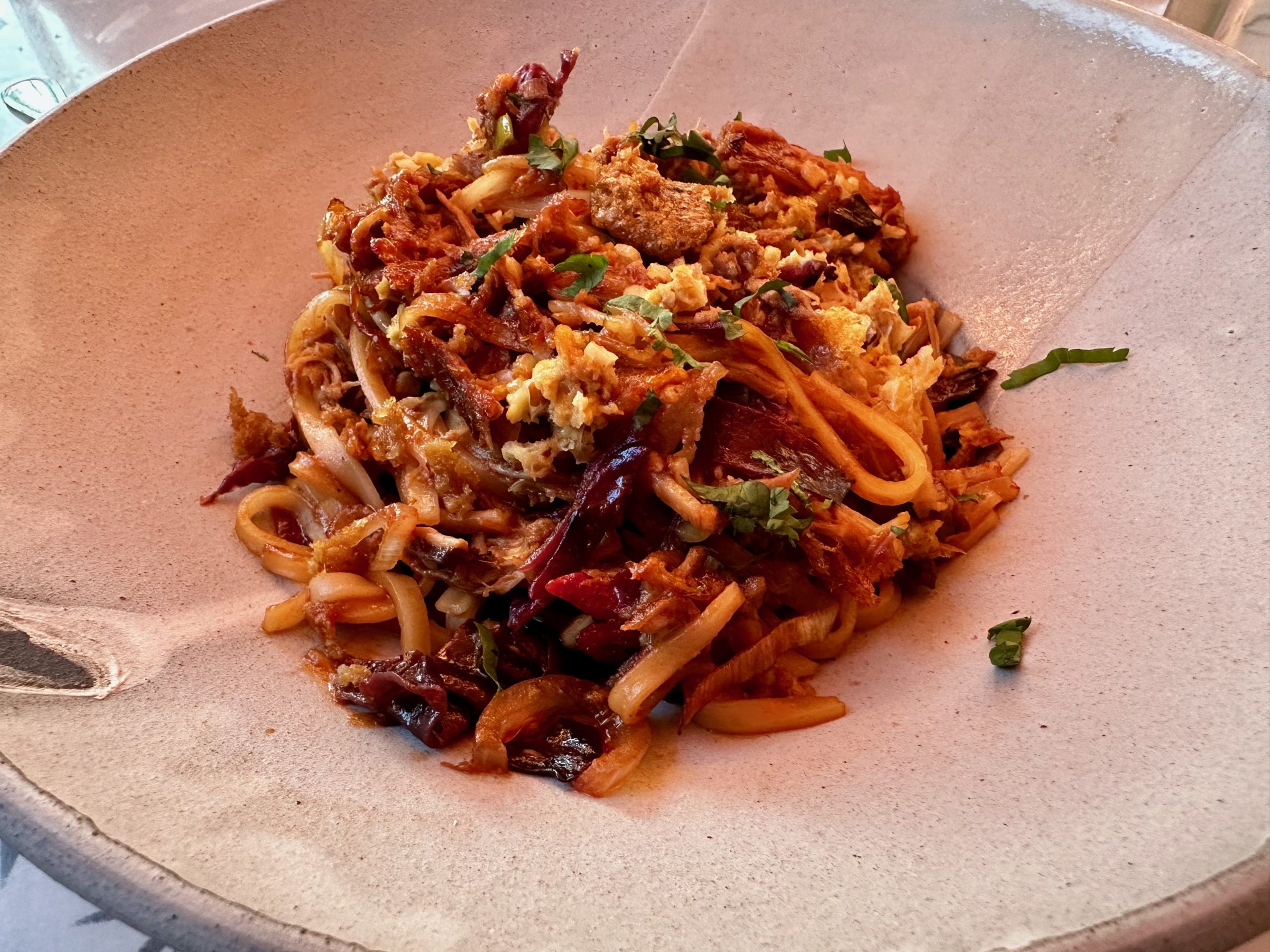 Longtime readers are probably tired of my whining about Pad Thai, a dish I’ve christened “Pad Boring.” I’ve typically found Pad Boring…er, Pad Thai “dumbed down for American tastes” in that it’s lacking in the balance of flavors common in many Thai dishes, skewed heavily toward cloying. Leave it to Chef Wrede to create a Pad Thai dish I should call “Pad Exciting.” It’s called “Duck Confit Pad Thai Style” and it features hoison-glazed duck confit, rice noodles, egg, peanuts, cilantro and charred cabbage. It’s got the balance of flavors–salty, sweet, spicy, sour, and creamy–all great Thai dishes should have. All these flavors complement one another; there’s no one dominant flavor profile. The hoisin-glaze imparts the sweet-tangy notes for which tamarind is normally used. The charred cabbage is purplish, much like a German slaw, but that’s the only commonality it has with either slaw or most cabbage dishes. It’s got both smoky notes and a crisp, tangy mouth-feel. Every element of Chef Wrede’s Pad Thai is the Pad Thai for those of us who don’t like Pad Thai.