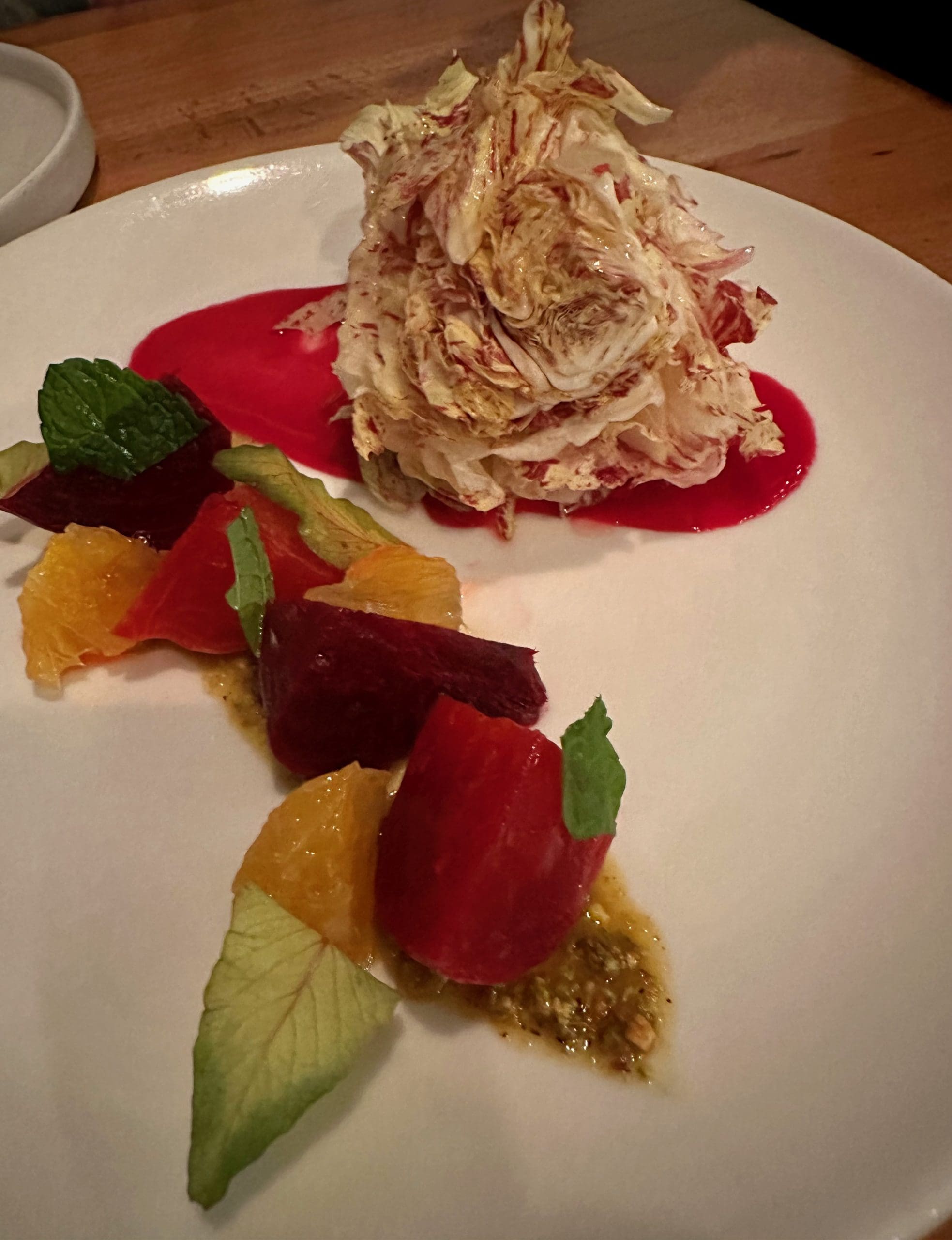 At the recommendation of friends from Tulsa who had dined at Mesa Provisions two nights previous, we ordered the beet and orange salad (pistachio, Castelfranco radicchio, mint) even though neither of us is a fan of radicchio, a lettuce lookalike noted for its acerbic flavor profile, especially when eaten raw. Radicchio is often paired on salads with sweet or acidic ingredients to balance flavors. Predictably, Linda and I loved the beets, the quartered orange pieces, the sprigs of mint and the accompanying sauces. The raddicio not so much.