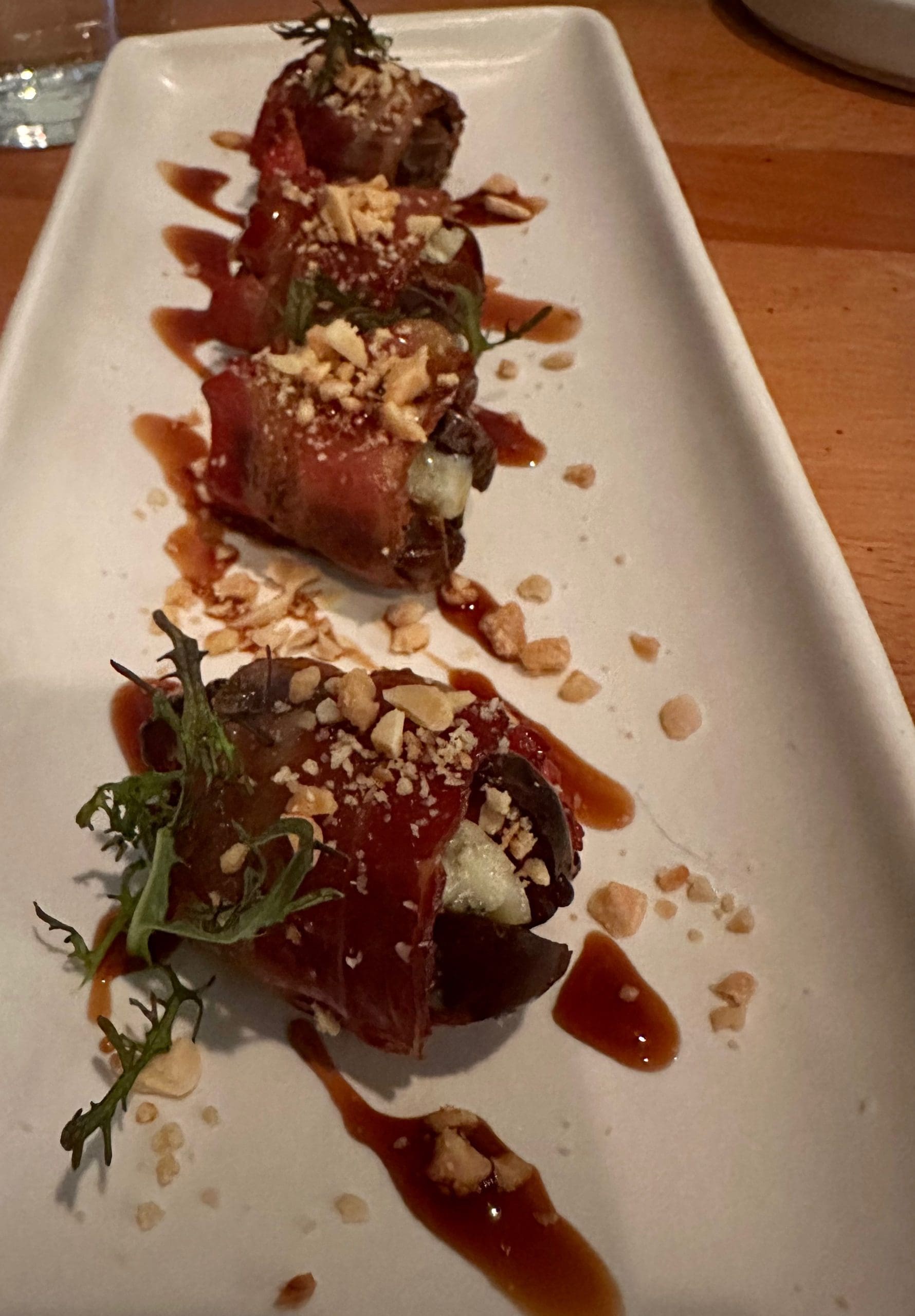 There are over 1,500 different varieties of dates varieties grown around the world. Dates grow in warm climates like California, Arizona, Florida and the Middle East. Because of their large size, almost caramel-like flavor and a soft, chewy texture, medjool dates are among the most popular of all dates. It’s become almost de rigueur for fine dining and tapas restaurants to serve bacon-wrapped dates. Mesa Provisions’ version is a composite of complementary flavors–smokey and salty bacon, earthy and sharp Gorgonzola, delicate and buttery crushed Marcona almonds in a sherry and date sauce. A serving consisted of four dates. We could have eaten a dozen.