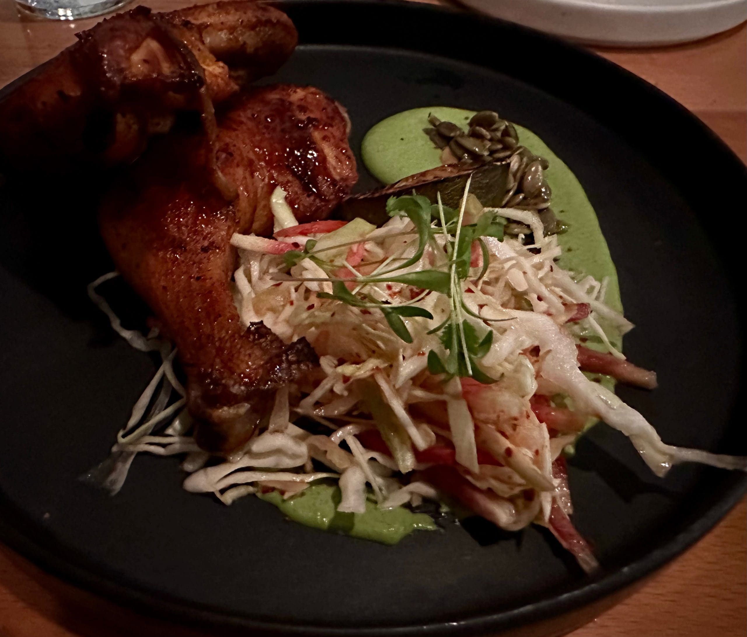 Despite rising food costs and runaway inflation, a Costco rotisserie chicken still costs $4.99, just as it has for more than two decades. No matter what restaurateurs do, that cheap chicken will forever be the standard against which every restaurant chicken will be compared–particularly when poultry is priced rather steeply. Mesa Provisions’ smoked half chicken is about twenty dollars more than Costco’s. You do get quite a bit more than just chicken at Mesa and it’s far superior than any sides (hot dogs?) Costco might offer. Mesa’s half chicken is not only smoked, but it’s brushed lightly with a sweet red chile glaze (which is most appreciated by diners who enjoy the skin). The chicken shares space with a cabbage slaw atop a slightly piquant pepita cream. The slaw is rather nondescript, but the pepita cream has real personality.
