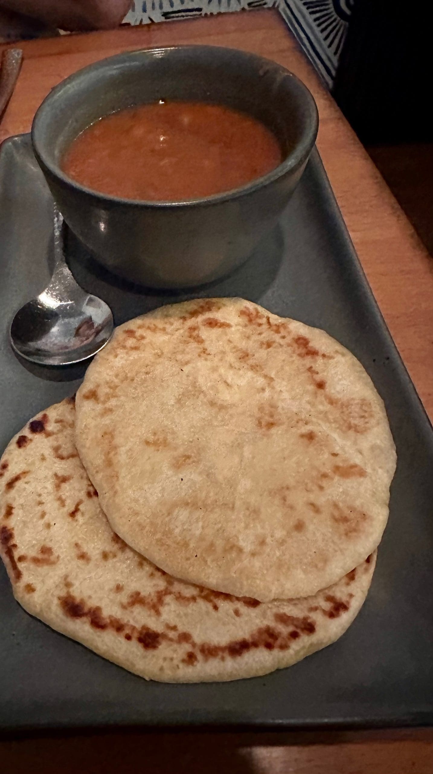 Served with the smoked half chicken is a bowl of New Mexico’s “other” official state vegetable–pinto beans with two duck fat tortillas. Of course this prompted a discussion about the Frontier Restaurant’s machine-made tortillas. Linda is far more accepting of those tortillas than your humble blogger is (remember I grew up with the best tortillera in Peñasco.) The duck fat tortillas have the characteristic pinto pony char and pliability which makes them the perfect “New Mexican spoon.” It did my heart good to see Linda use the tortillas as her spoon, too. Duck fat is increasingly growing in popularity thanks to its subtle flavor and silky mouthfeel. It makes everything taste better.