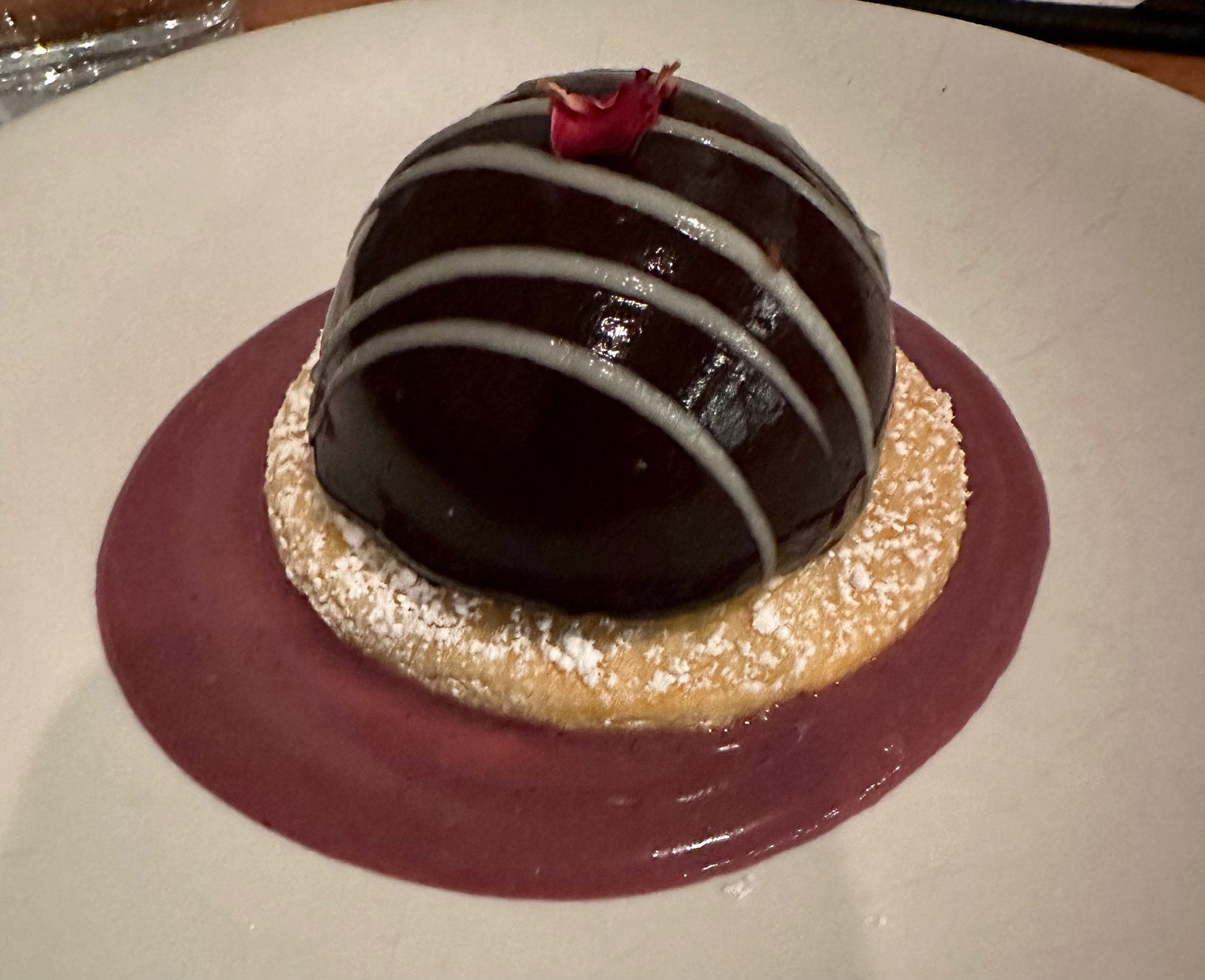 Desserts (“Sweet Stuff” on the menu) are as beautifully composed and creative as any post-prandial pleasure-giver you’ll find in Albuquerque. Take the chocolate entremet. Entremets are defined by Dessertians as “a cake composed of multiple components assembled into layers, encased in a mousse, enrobed with a glaze and topped with fine decorations.” I first had an entremet in France, but largely preferred gateaus. Most desserts are comprised of complementary elements. The choclate entremet surprised us in its bold declaration that ingredients don’t always have to play off one another. Neither of us “got” the black currant, a strong, tart, tannin-rich element that obfuscated other flavors. The canvas for the hemispheric chocolate was a pate sucrée, a sweet French tart dough with a cookie-like texture that’s sturdy enough to support many kinds of fillings without turning into a crumbly mess.