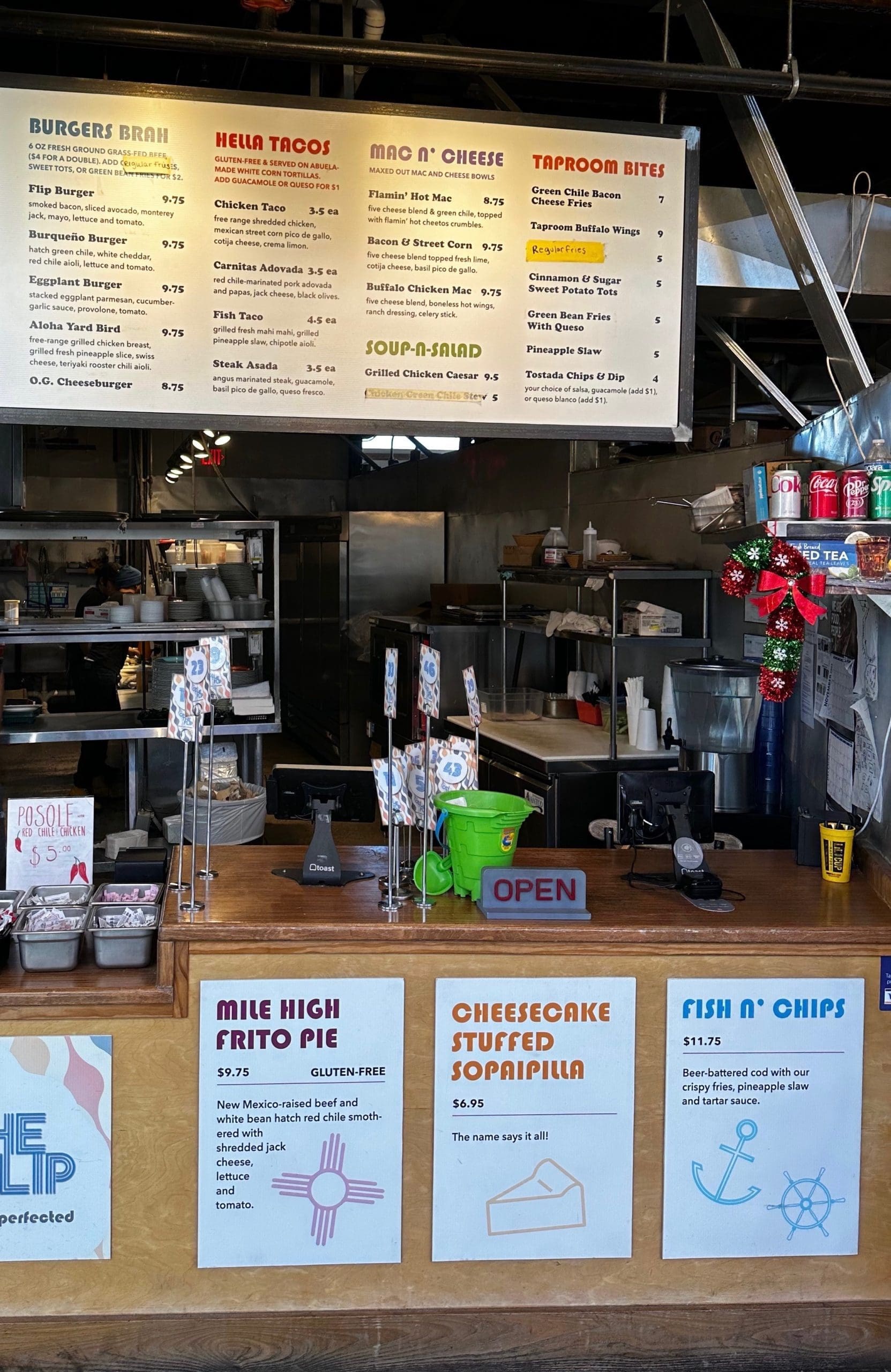 Perhaps On The Flip recognizes the only beach in Albuquerque is Tingley Beach near the Rio Grande where the only seafood you’re likely to snare are silvery minnows and tin cans. On The Flip’s menu is a landlubber’s delight showcasing burgers, tacos, mac & cheese, soup and salad and “taproom bites.” It’s not an overly ambitious menu, but that’s on par with other “pods” within the Tin Can Alley. If you’ve never visited, Tin Can Alley is easily one of the Land of Enchantment’s most unique and striking eating, drinking and shipping venues, an 11,000-square-foot behemoth housing ten local businesses all under one roof. Nay-sayers might tell you the exterior resembles a dystopian structure, but within the capacious two-story venue is a colorful and comfortable milieu that’s home to ten local restaurants and shops–including On The Flip.