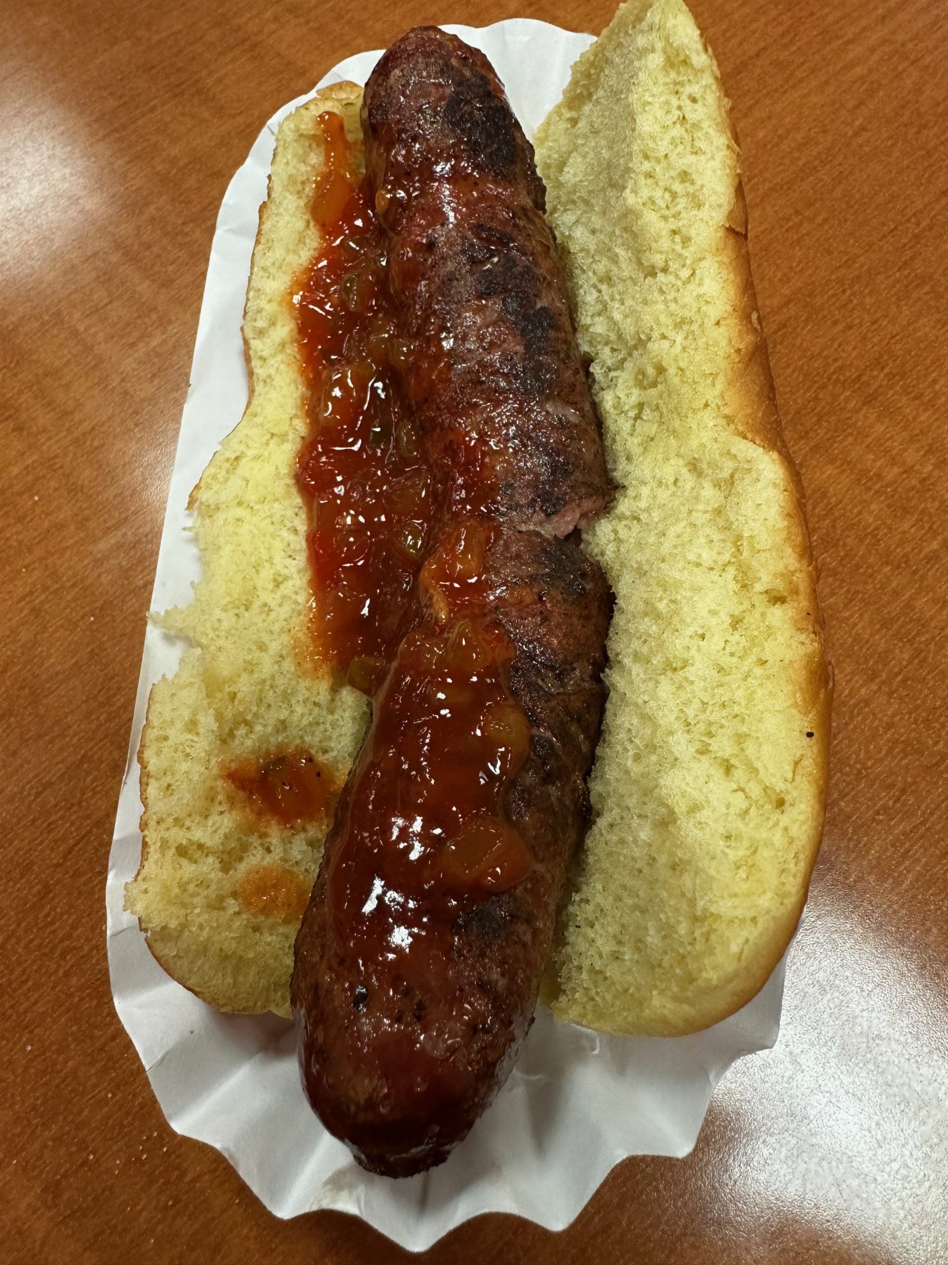 20 December 2023: Much as I love chargrilled hot dogs, it was impossible to pass up a Polish sausage sandwich dressed with Ted’s Hot Sauce. Polish sausage has a characteristically rich smokiness which–compounded with chargrilling–brings out other dimensions of deliciousness. Polish sausage is made with some common ingredients (salt, pepper, lots of garlic) and sweet marjoram, another interesting spice. Ted’s Hot Sauce is the perfect bread spread for the diverse and delicious Polish sausage. The interplay of ingredients, seasonings and preparation methods were fabulous.