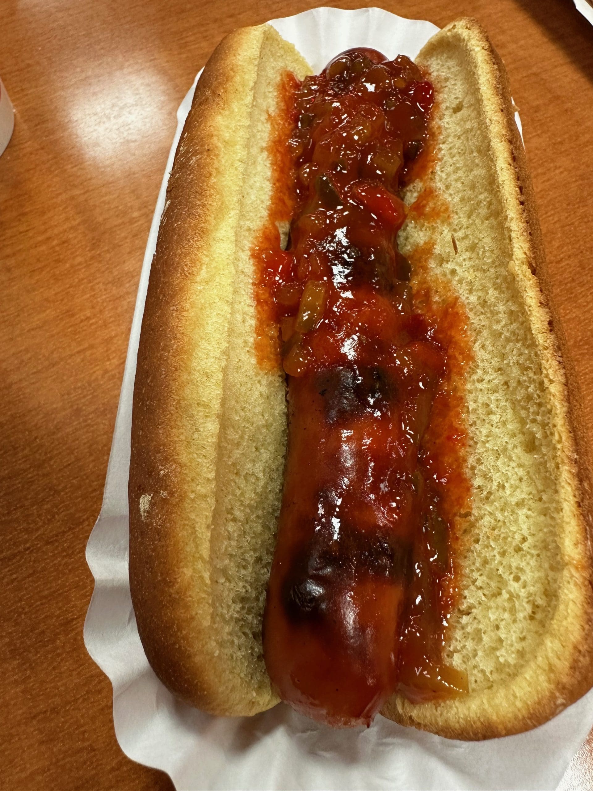 20 December 2023: My Kim dressed her hot dog with all her favorites: mustard, relish and onions while mine was adorned solely with the addictive Ted’s Hot Sauce. The only other chargrilled hot dogs we’ve ever had were at family picnics so it was as if Ted himself was preparing the repast before us.