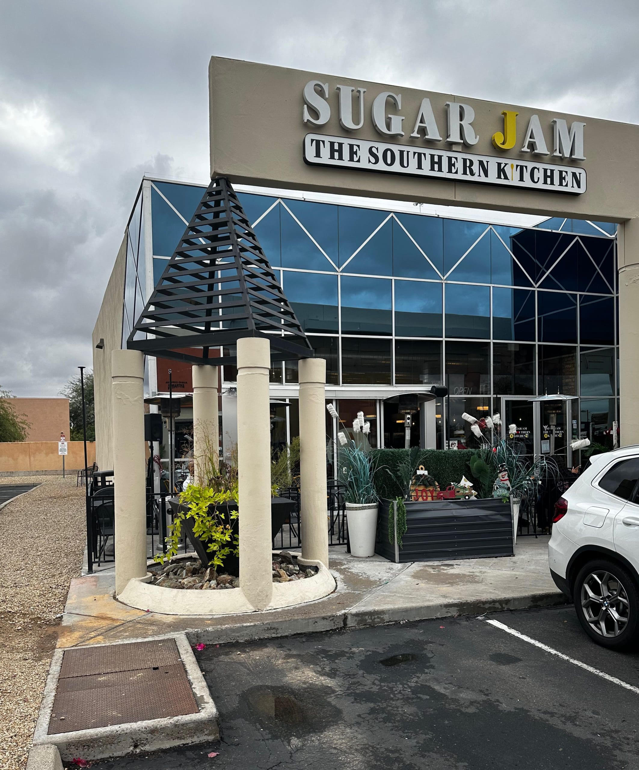 Before my Kim and I travel outside our homestate, I research the dining opportunities at our destination, in particular scouring trusted sites for restaurants we can’t find in New Mexico. The Phoenix area has a number of Southern restaurants. Yelp’s highest rated (4.5 stars on more than 1,000 reviews) as of this writing is Sugar Jam. Other sources wax eloquent about this popular Cabrona virus survivor that got its start as a cookie bakery. After three years of touring farmers markets – adding delectable pies to her menu – owner Dana Dumas launched her first store, Sugar Jam Bake Shop and Bistro, in Scottsdale Airpark in 2014 and remained there for six years. Sugar Jam moved to its current location in 2022.