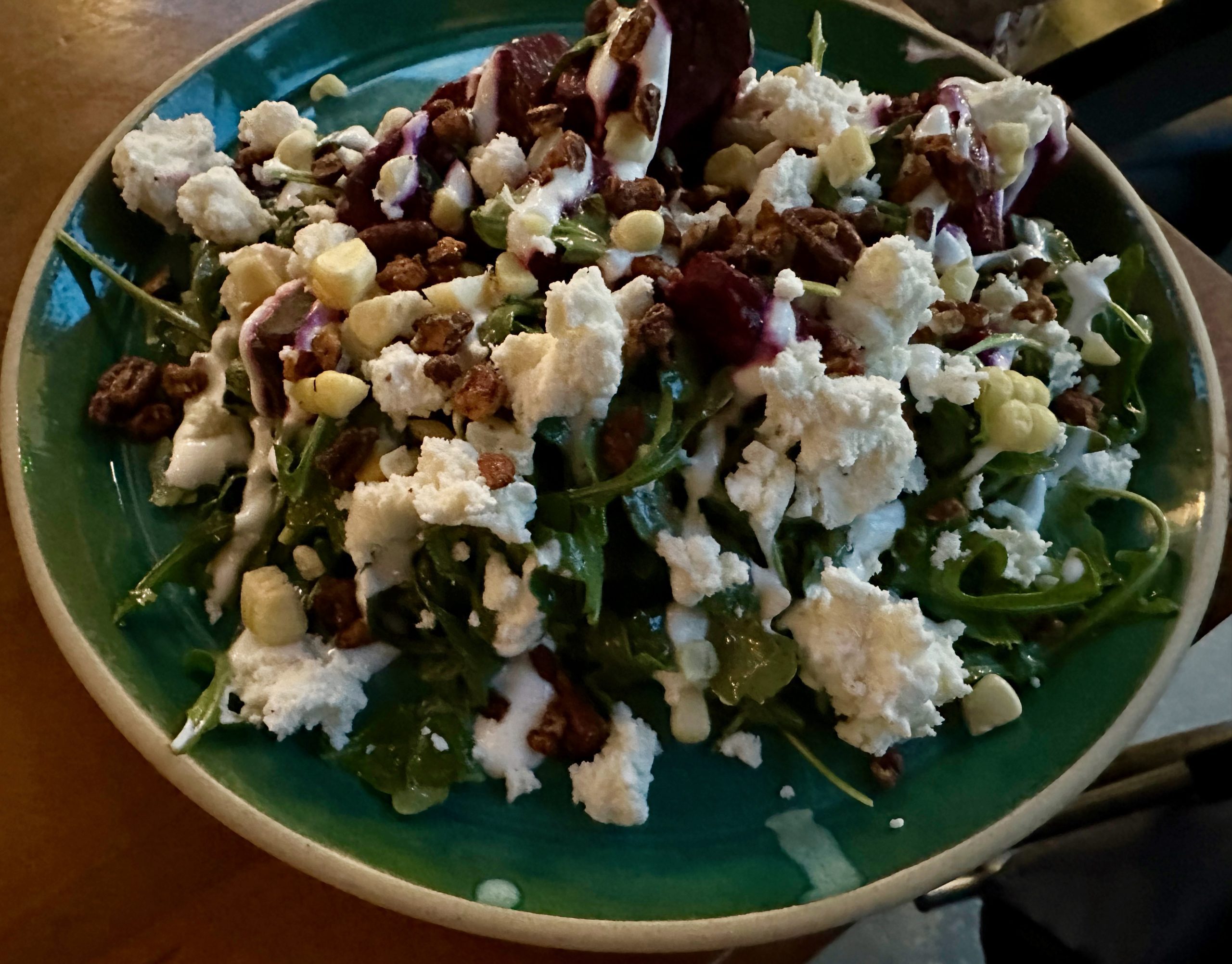 Much better–as in maybe the best we’ve ever had–is the roasted beet salad (arugula, honey pecans, crema Jocoque, roasted elote, poppy seed vinaigrette). Its become almost inevitable that we order beet salad when it’s on the menu. We love the sweet earthiness of the beets along with any accompanying ingredients. Crema Jocoque, a buttermilk-style cream with a balance between cream and yogurt was a first for us both. It’s got a flavor somewhat between creme fraiche, sour cream, and Lebanese labneh and provides a wonderful counterbalance to the honey pecans and roasted elote, both of which are pleasantly sweet. The roasted beets were superb in their earthiness and sweet profile. Then there’s the poppy seed vinaigrette with sweet and mild notes reminiscent of citrus.
