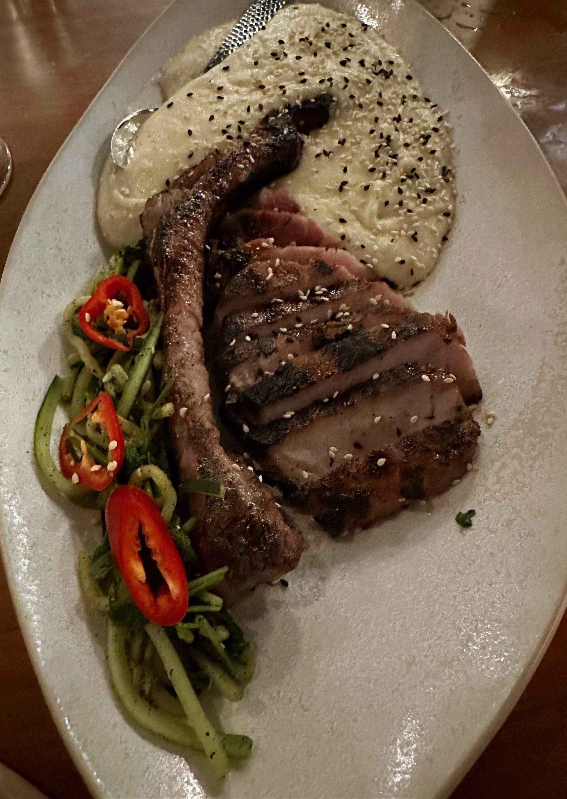 Seeing “Ibeico bone-in pork chop” was a no-brainer as to what Kim would be having. Available on the daily specials menu, it’s a dish that showcases the capabilities of the wood-fired grill. Ordinarily served with a morita chile glaze (which my Kim eschewed), mashed potatoes and a cucumber, jicama and cilantro salad, this is a magnificent plate. The pork chop is sliced into half-inch thick medallions with the bone detached so diners can gnaw on it. Flame-kissed with just a hint of sweetness, the pork was as tender as my Kim’s heart and were moist and delicious. The mashed potatoes were whipped to within an inch of their lives (the way we like them) and were enhanced with cracked pepper and sesame seeds. Very few restaurant-made mashed potatoes have impressed us as much.