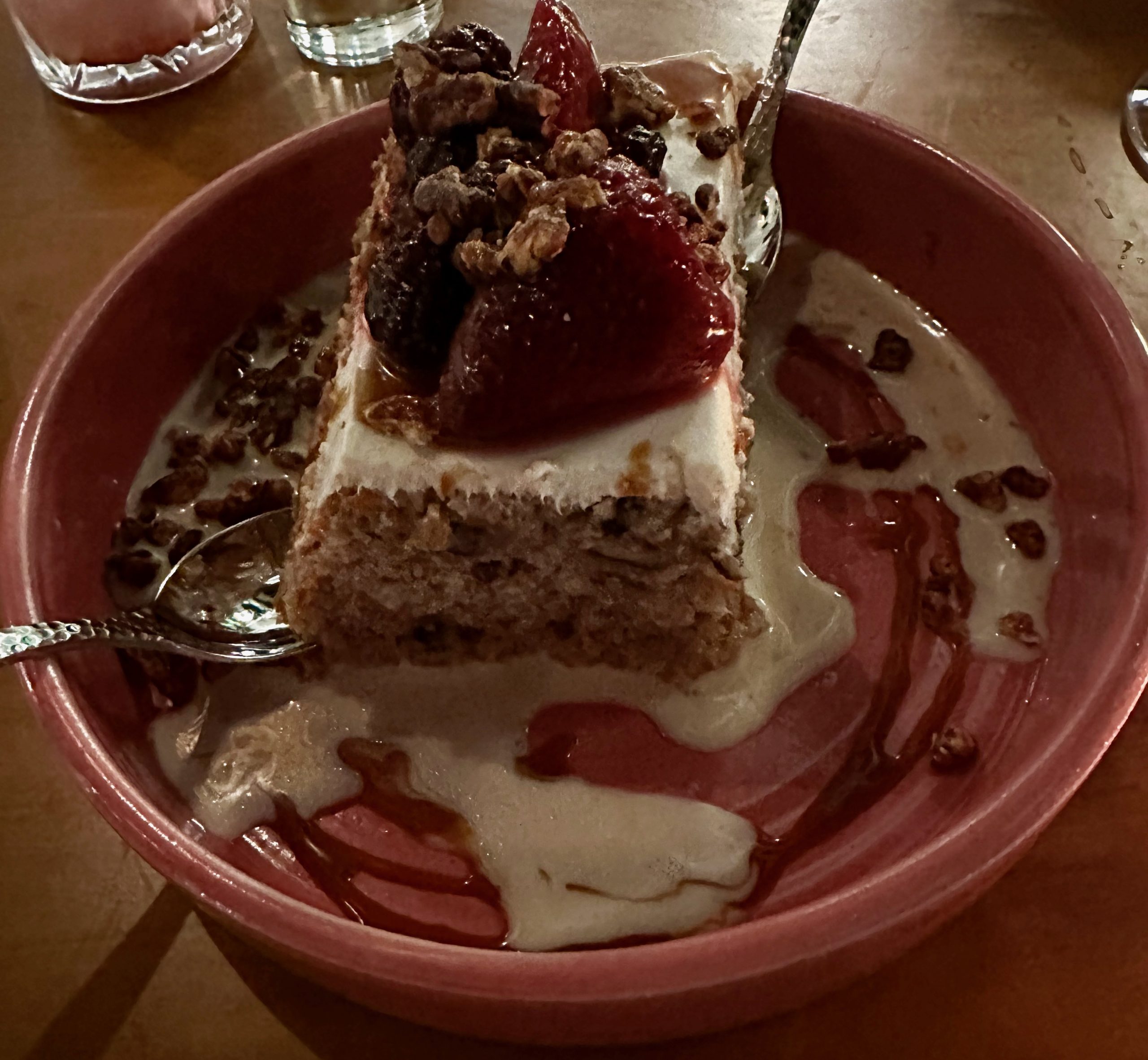 My Kim has never liked carrot cake (which might explain her need to wear glasses and contact lenses). My vision (20/15) is almost the equal of Bugs Bunny’s though you can’t attribute my acuity to carrots. Maybe I can develop x-ray vision by eating more slabs of Cocina Chiwas’ tres leches carrot cake (with candied pecans, cajeta and berry compote). Even if all it does is make me more rotund, this is one carrot cake not to be passed up. We didn’t get much conventional “tres leches” out of it in that it didn’t leak profusely as we pressed our forks down on it, but hey, this isn’t grandma’s tres leches cake. It’s still one of the very best we’ve had especially when we came upon candied pecans and cajeta, an unbeatable combination.