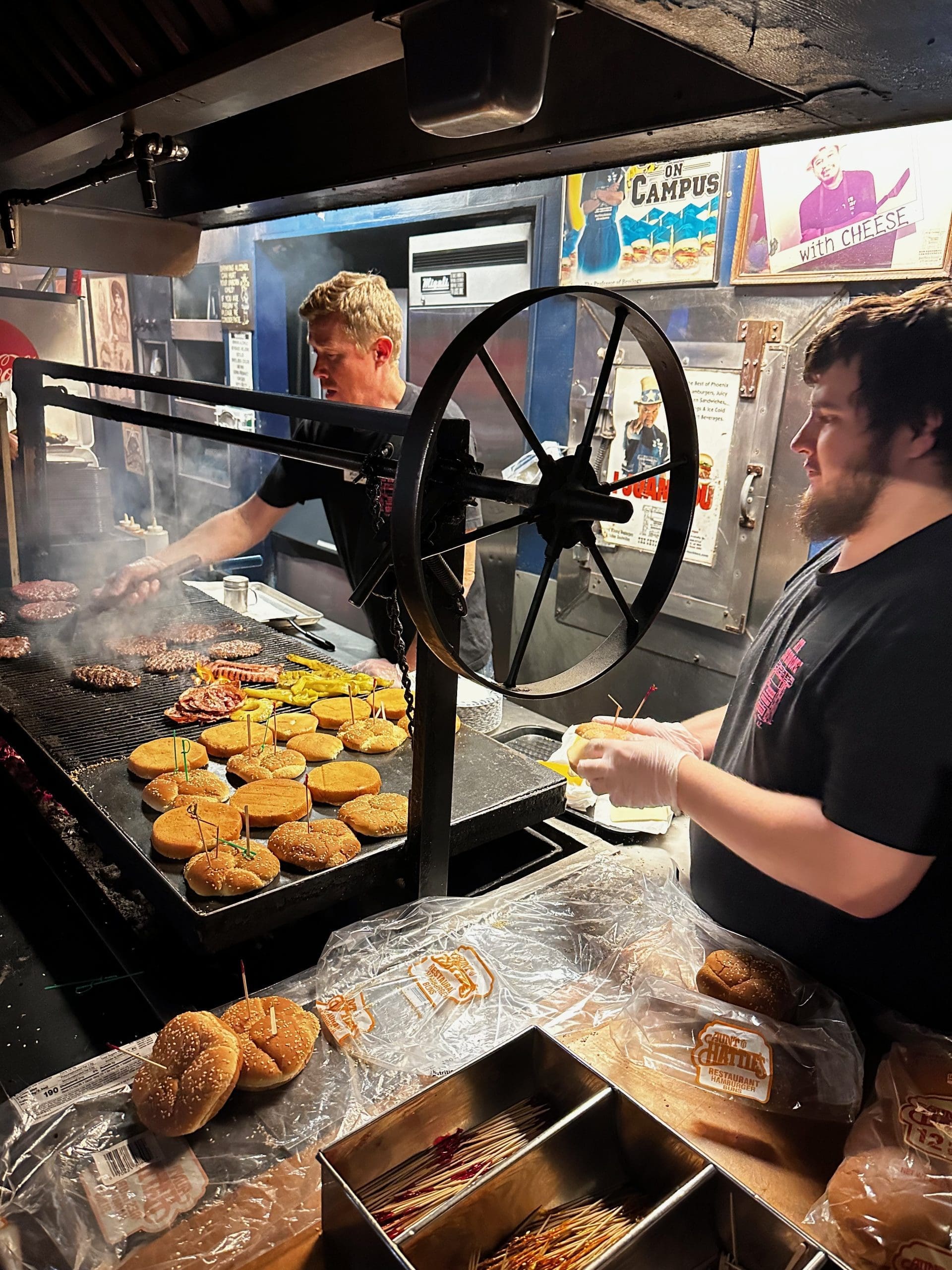 If photos of The Chuckbox’s interior are conspicuous by their absence, it’s because the restaurant is perpetually so crowded that you’re bound to photograph someone’s nostrils instead of the dining room. As soon as you enter the restaurant, you’ll find yourself in line. Don’t have cash on hand? There’s an ATM on the premises; it’s on the way to the “exhibition kitchen” where you can watch your burgers being prepared on a unique grill contraption that sits above a charcoal pit. The grill rises and lowers with the turn of a wheel. By the way, you’ll be asked for your order while you’re still in line, as much as ten-deep in line. As you place your order, the “order taker” will begin the process of somehow managing dozens of orders. He won’t imbibe nearly as much smoke as the guy who’s actually flipping the burgers, but it’s likely both of them smell like burgers when they get home.