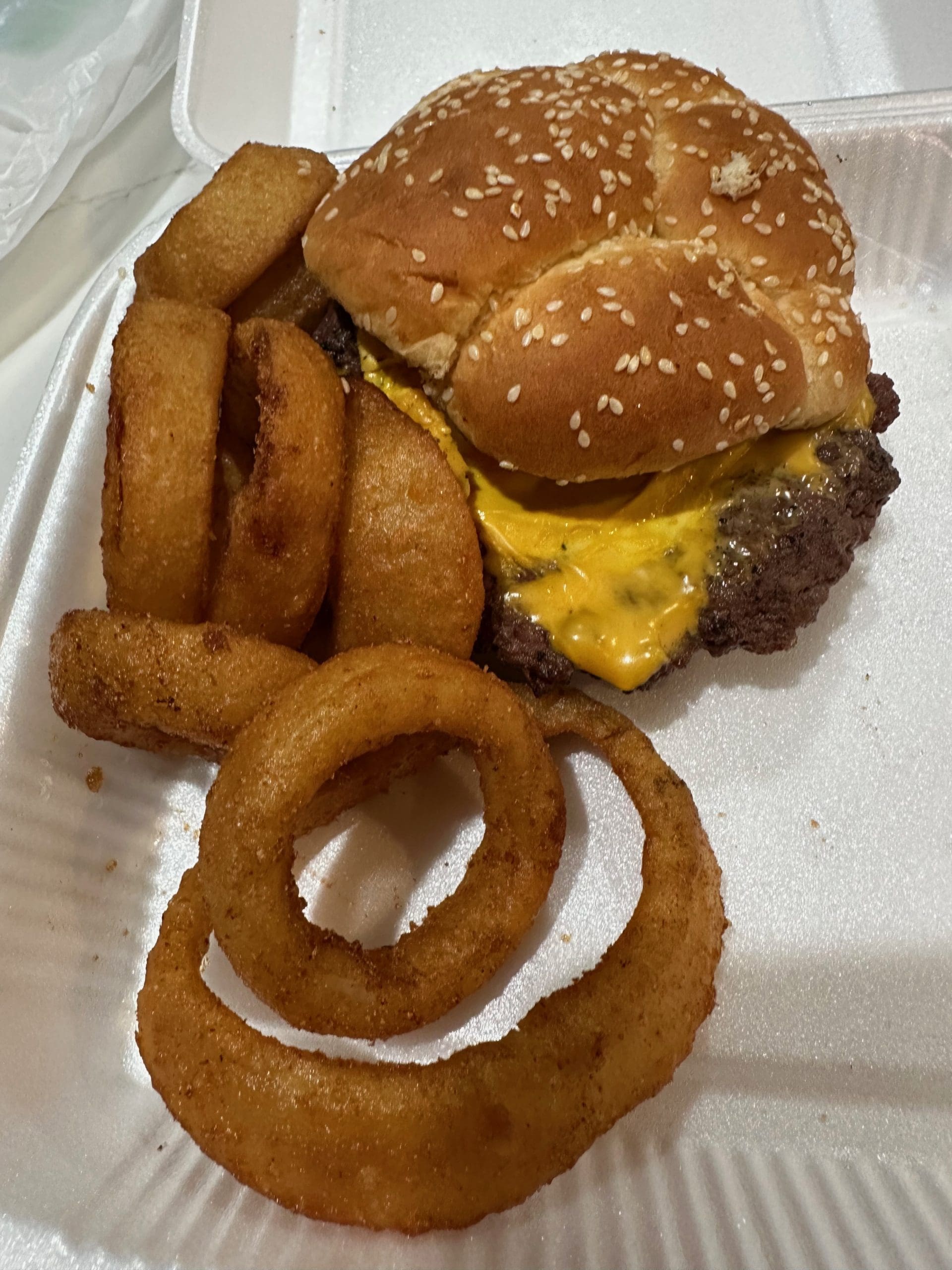 It’s no exaggeration that I’ve driven past The Chuckbox fifty times before finally deciding to stop. It helped that Arizona State was on a winter break and a parking spot could be found within half a mile of the restaurant. Both the line and the spoken volume (the equivalent of four F-16s reving their engines) almost dissuaded me from staying, but community service often comes with a price. Unlike collegiate diners and their friends, I ordered the Really Big One (1/2-pound of specially ground beef) and onion rings without chuckling. Adorned with American cheese draped over the beef like a molten blanket, the beef did indeed have a terrific flavor compounded by the char-broiling process. My only additives were onions and mustard. Nothing more was needed.