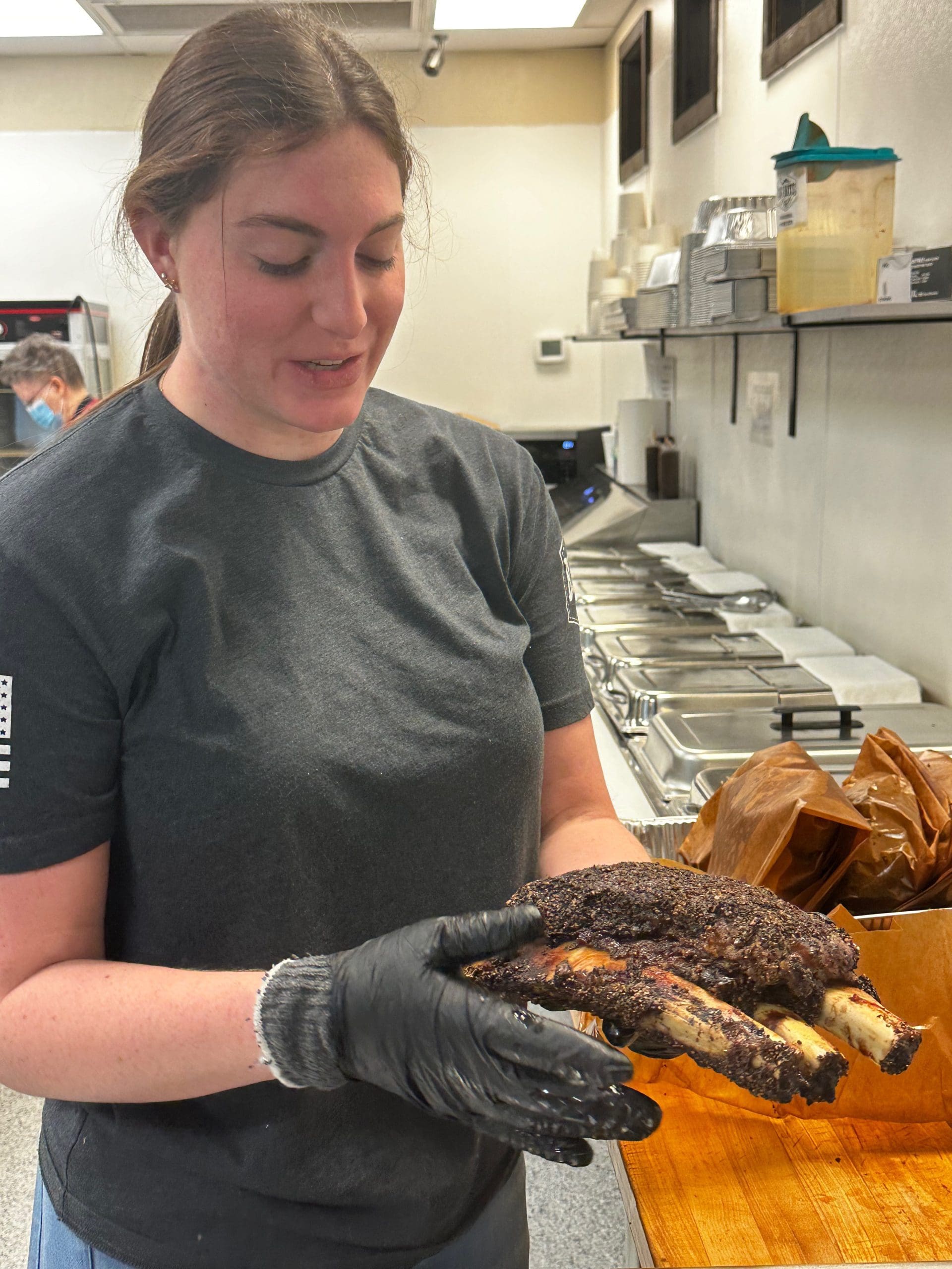 Los Hermanos Silver, two of the very finest people I’ve ever met, are men after my own heart. Not only do they perpetually crave beef ribs, they’re curious to the nth degree. They ask intelligent questions that pry into a restaurant’s operation–not as annoying critics do, but as genuinely interested diners. We were invited to a back room adjacent to the dining room where my friends discussed Big Nate’s beef ribs, all of which are smoked for 12 hours. Beef ribs are available only on Fridays. Big Nate’s smokes about 30 ribs every Friday and tends to sell out early. None of us had an inkling whether a one-pound rib or a two-pound rib would sate us. Our very kind hostess (below) demonstrated the Flintstonian ribs for us. Ultimately, we each decided on ribs weighing between 1.1 and 1.3 pounds.