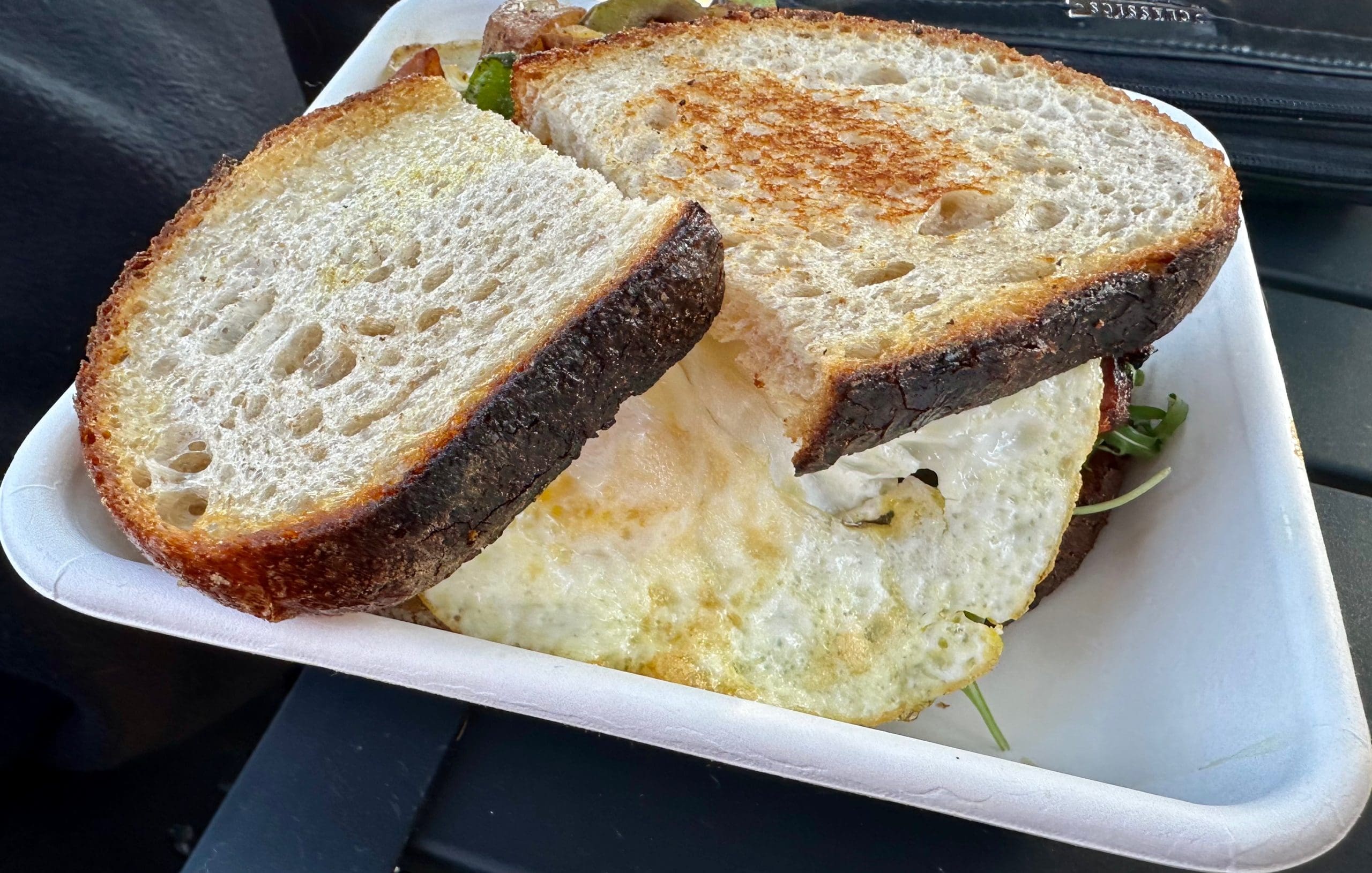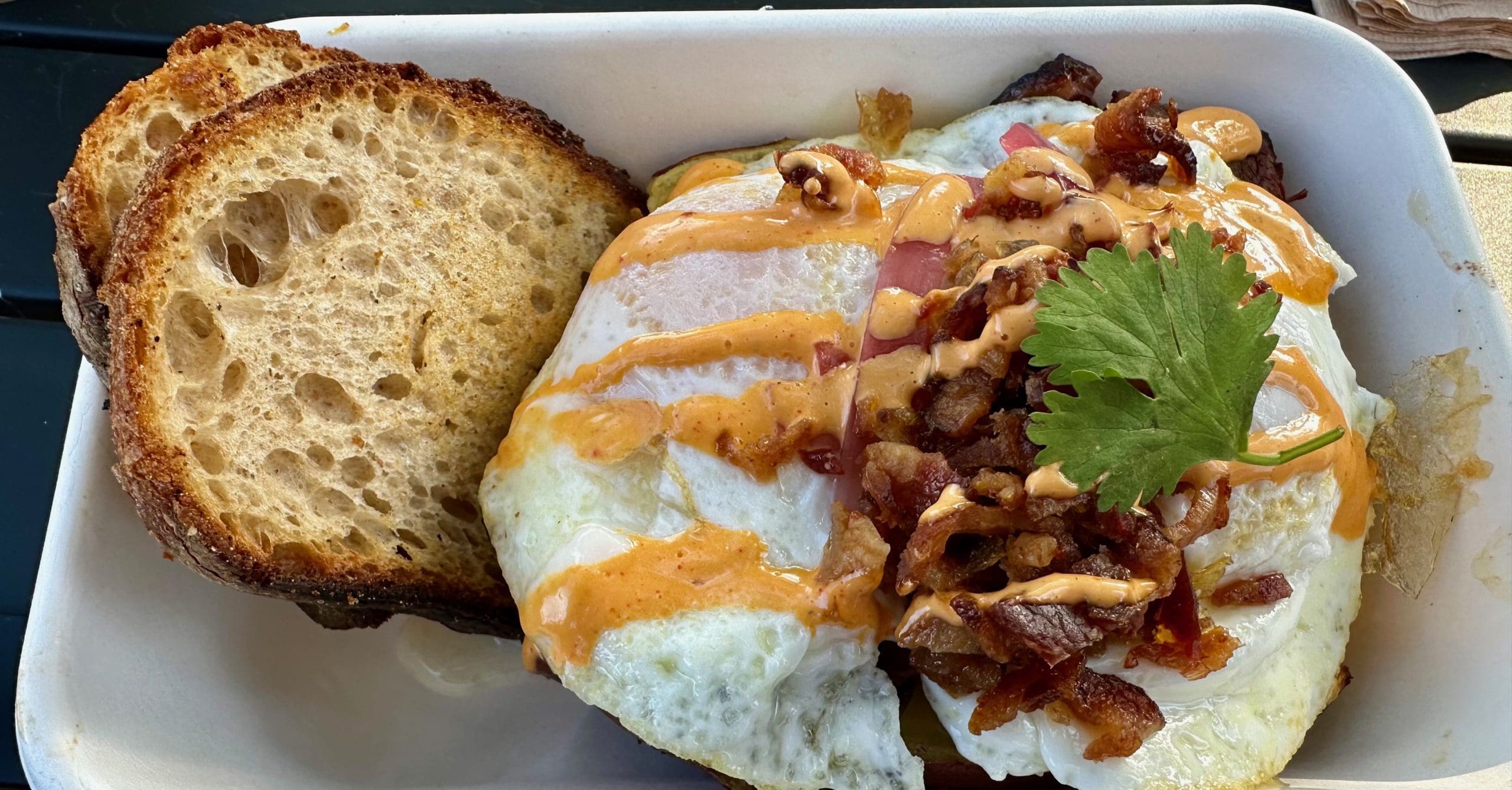 2 January 2024: In 2014, Chef Claudio Urciuoli (one of my culinary heroes) co-founded the oven-focused Noble Eatery under the banner of Noble Bread’s already established name. Noble Eatery quickly became one of the Valley’s most popular dining destinations. Though Chef Urciuoli left Noble Eatery, the bakery and eatery continue to thrive. It made me very happy to hear my Kim order the Noble Bread brisket and eggs sandwich, a breakfast offering truly worthy of nobility. This sandwich is constructed with house-smoked brisket, caramelized onions, oven-dried tomatoes, New Mexico “chili” sauce and arugula on toasted country loaf bread topped with two eggs any style and served with farm home fries. It’s one of the best breakfast sandwiches we’ve ever had–even sans the green chili which only one of us was excited to try.