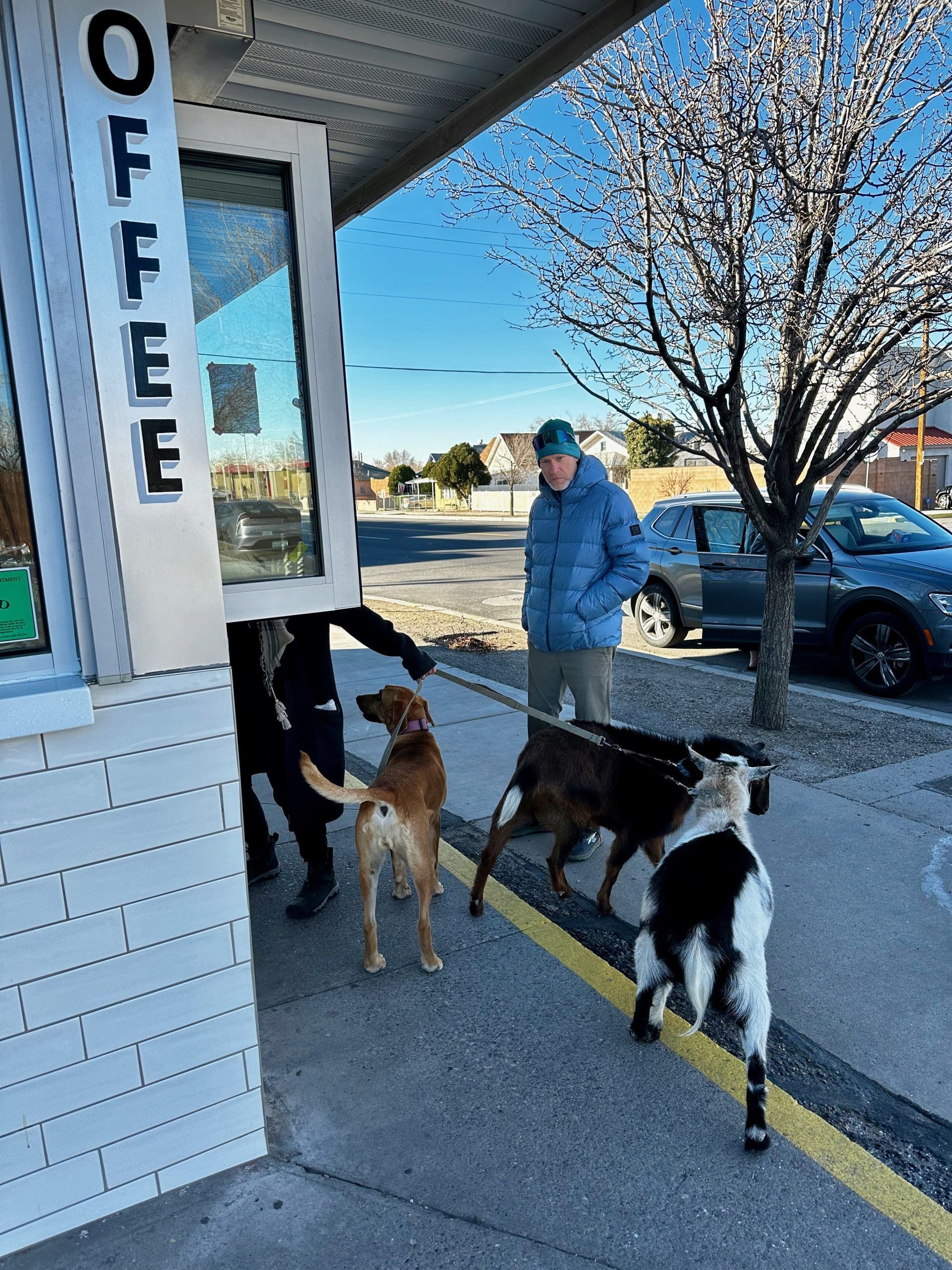 A number of equally cheerful morning people, some of whom braved Albuquerque’s grouchy drivers were already in line. On some days–especially in summer–lines stretch like at a Taylor Swift concert. Behind me in line was a veritable menagerie of wagging tails–two goats named Dave and John and a dog named Daisy. How could you not be a morning person around dog and goat breath? Their human best friend apprised me that goats are even smarter than dogs and they bond just as well. Naturally I now want a couple goats though The Dude, our debonair dachshund might not be happy if he’s not the single focus of our attention.