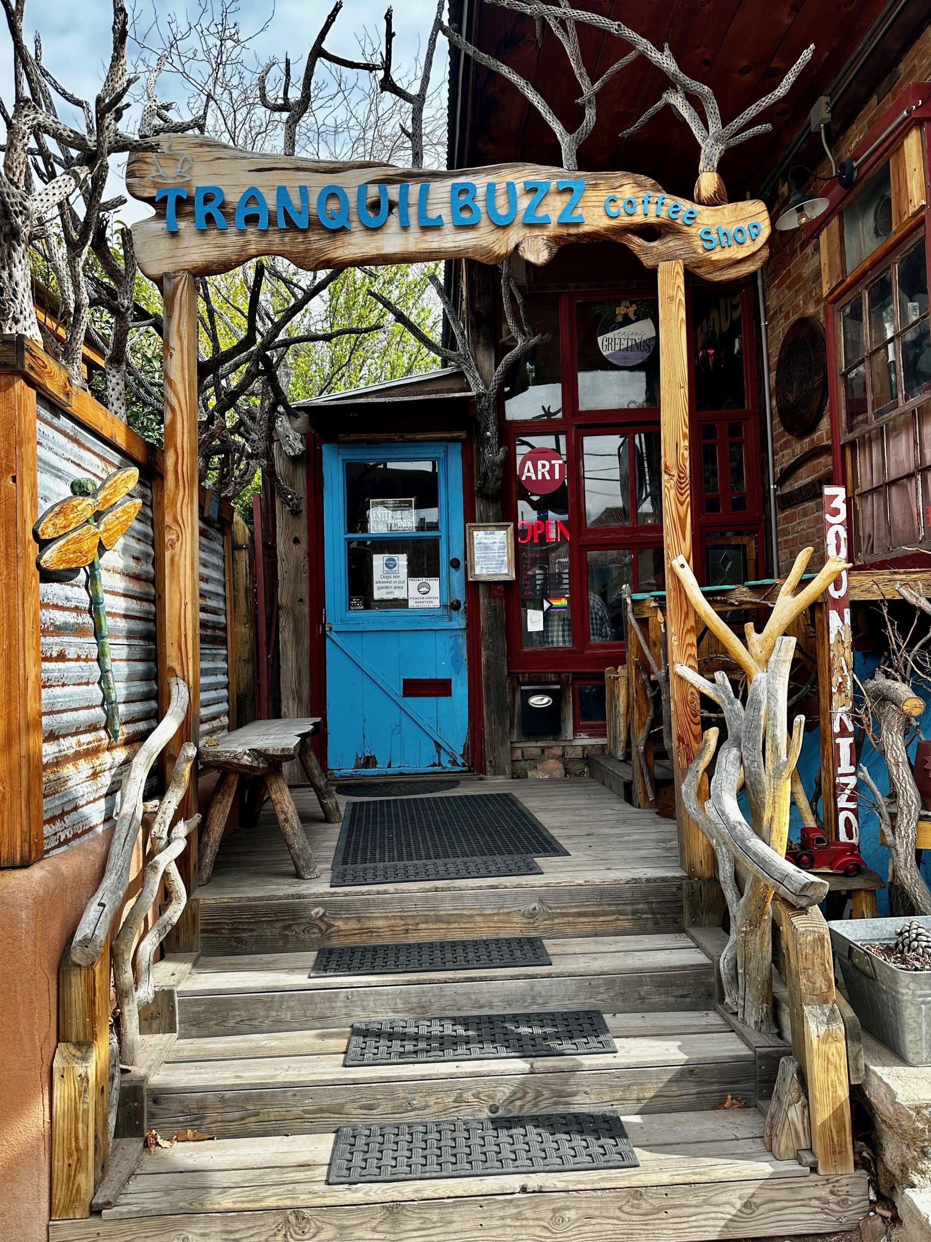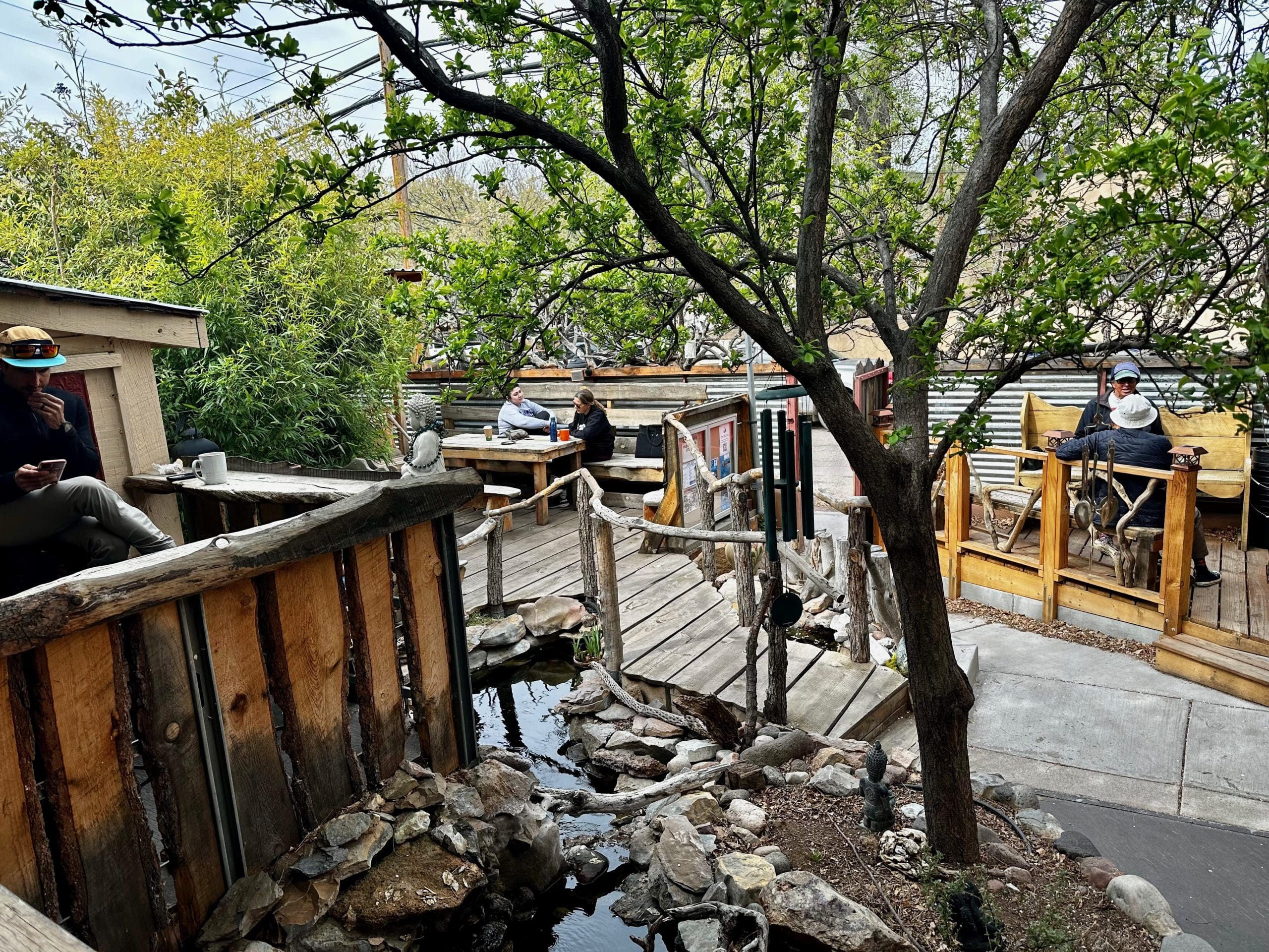 Approach Tranquil Buzz through the Arizona Street gated entrance and you might be reminded of Swiss Family Robinson’s treehouse with boardwalks that meander under towering deciduous trees and past a small pond in which koi swim merrily. Along the boardwalk are several nooks and crannies in which coffee drinkers enjoy al fresco coffee drinking. It reminded me of the club houses my brothers and I built with our friends Estevan (former commissioner of the Bureau of Reclamation) and Gabriel Lopez (former Vice President for Research at the University of New Mexico). (Forgive my name-dropping but I love those guys.) We built our club houses from branches, twigs, stray boards and whatever else we might run across.