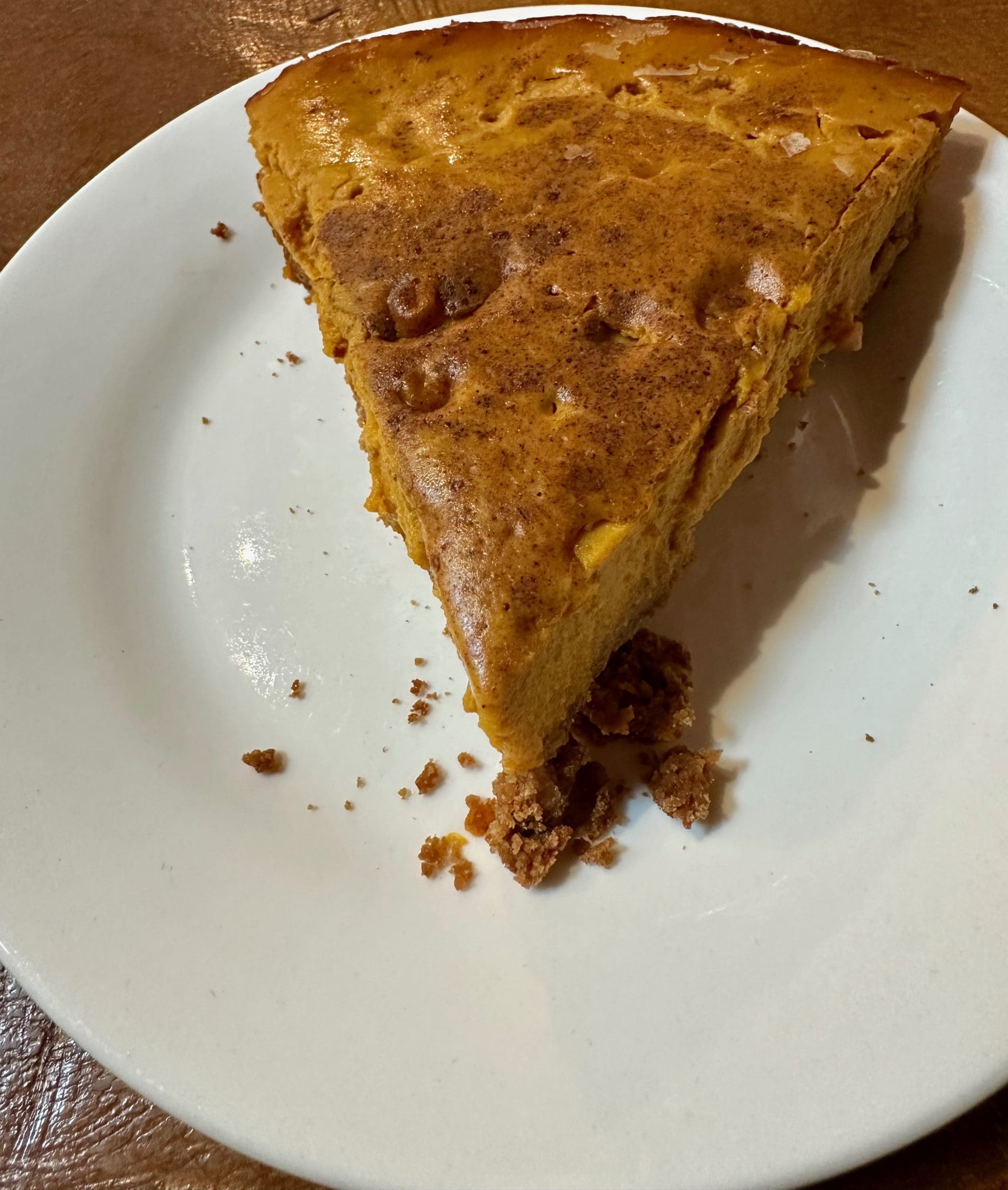 Since you now know my Kim can’t get enough pumpkin spice, it won’t surprise you to read that for three consecutive visits she had Tranquil Buzz’s unique pumpkin pie cheesecake. That I can certify as absolutely delicious: not too sweet, spiced to perfection and best of all, available in April, five months after Thanksgiving. Though I can take or leave pumpkin spice, it’s a different story with pumpkin pie. My mom baked the most wonderful pumpkin pies in New Mexico. My brothers and I would “steal” one (or five) pies and hide the empty pie tins under our sisters’ beds.