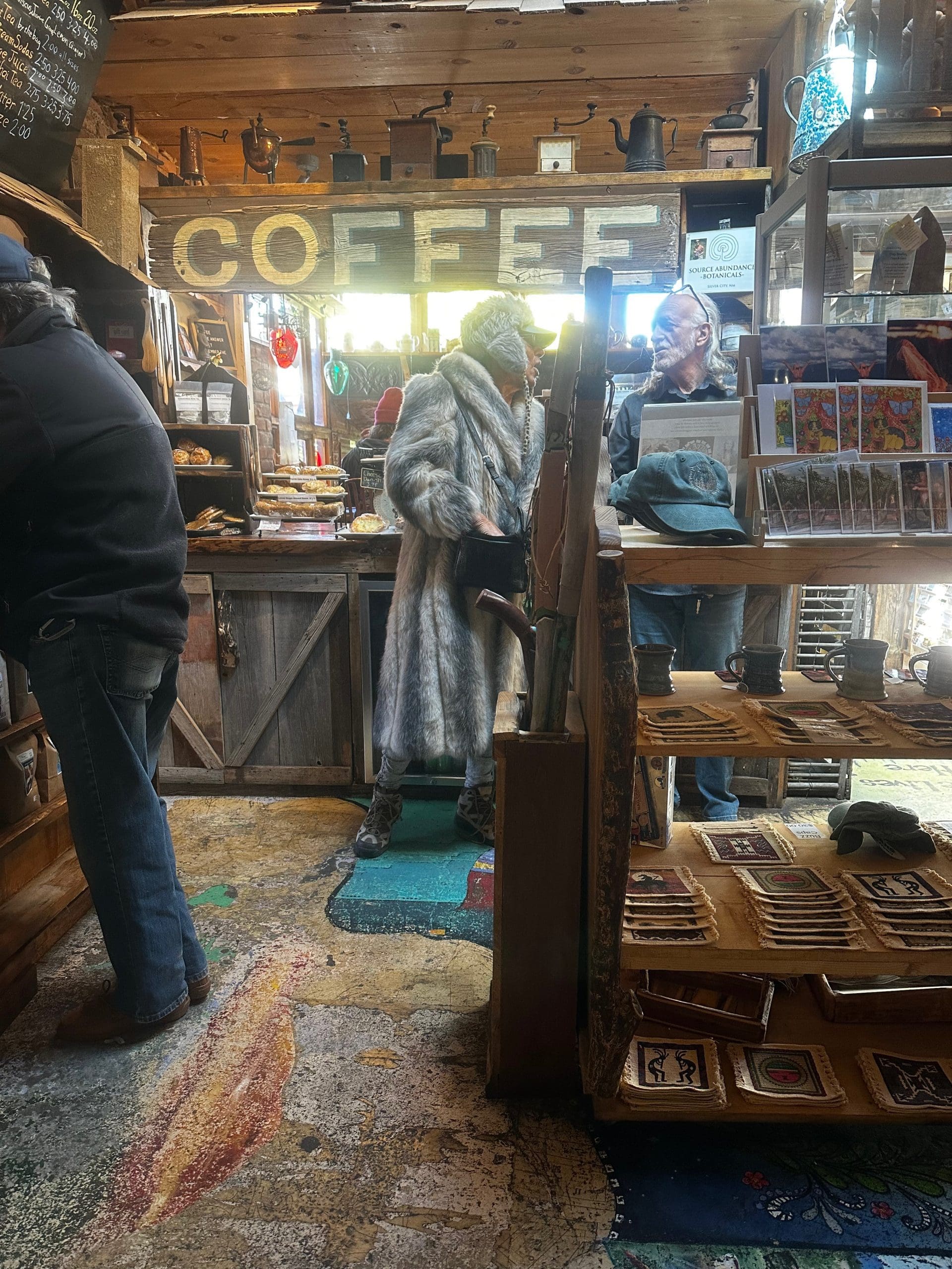 The rustic ambiance belies homey and “come as you are” comfiness of this coffee haven. On the windiest and coldest day of our stay, one of the patrons (photographed below) was covered in fur from head to toe. It brought to mind the Will Geer character in the movie Jeremiah Johnson. Visitors among us were unprepared for the unseasonal April weather. Luckly the coffee was more than up for the task of warming us up. Our hearts were further warmed by the friendliness of other guests, many of whom were drawn to us by The Dude. Seriously, Silver City may be the friendliest city in New Mexico.