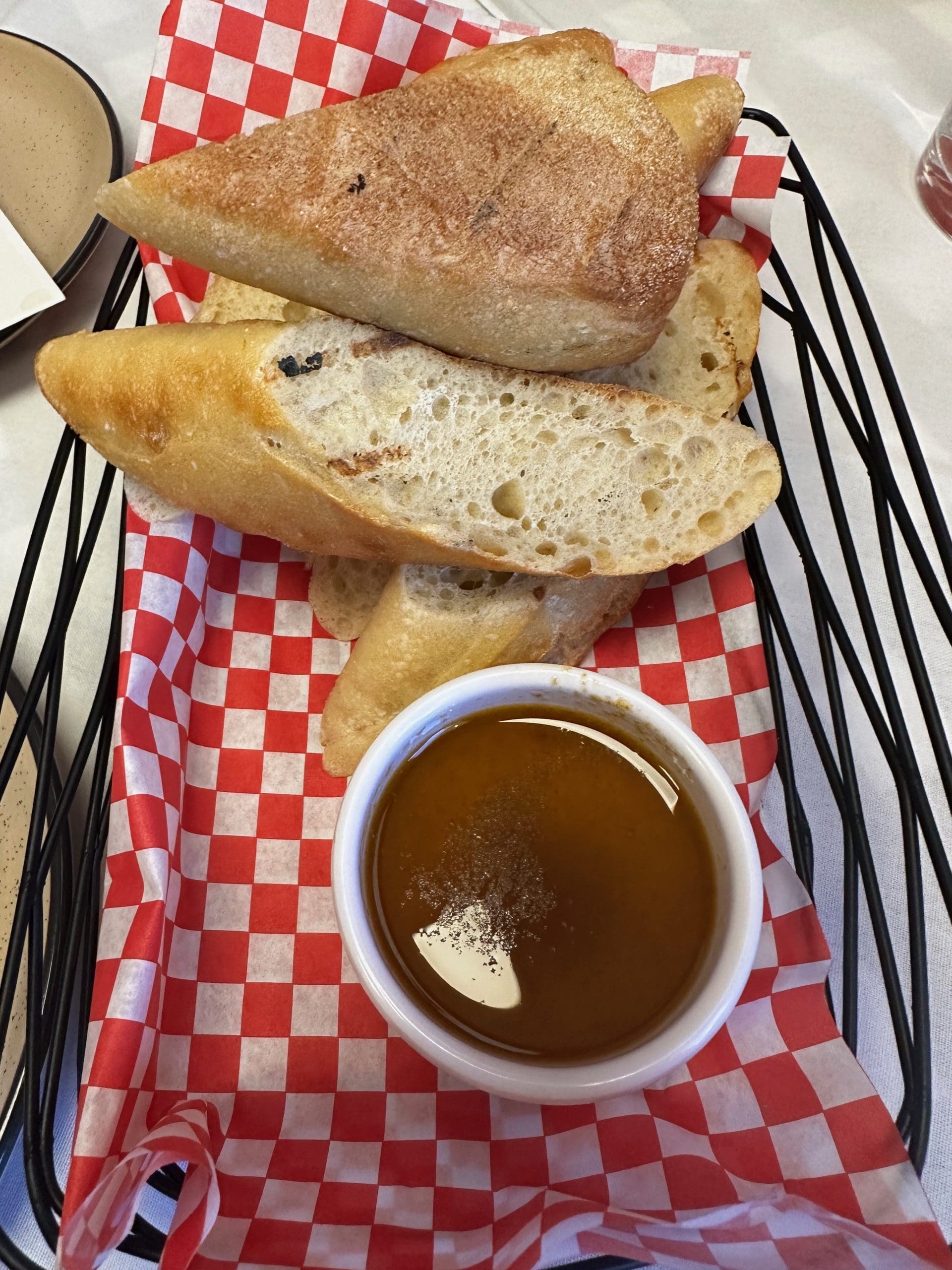 25 April 2024: Our foursome started our meal with a bread basket (lightly toasted baguette served with Calabrian chili oil). Calabrian chili peppers come from the Calabria region of Southern Italy. Though a number of chili peppers are now grown throughout Europe, specific growing conditions–optimum heat and sunlight, fecund soil, light rain–in the Calabrian region help distinguish Calabrian chile peppers from their counterparts elsewhere. Calabrian peppers are spicy and smoky with just enough heat to be discernible. Linda, Nancy and I had no problems with the heat though it was a bit much for my Kim.